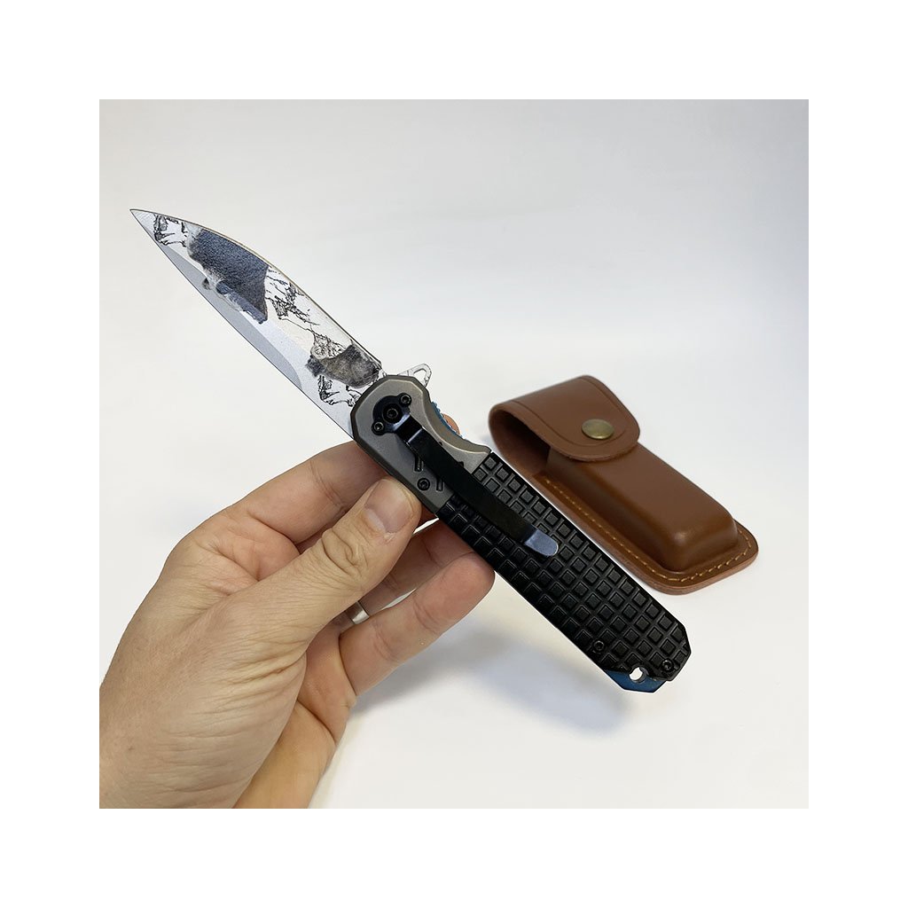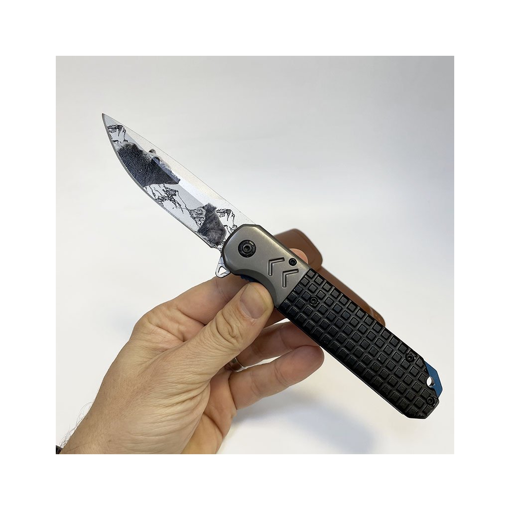 Moderní vyklápěcí nůž malba na čepeli GRIZLY s možností koženého pouzdra s vlastním textem + prémiové dárkové balení BE Original