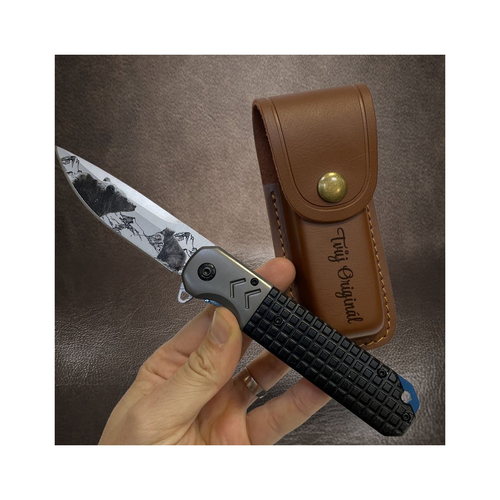 Nádherný kousek, extra kvalitní kovový vyklápěcí nůž s nádhernou malbou medvěda na čepeli. Navíc včetně koženého pouzdra, na které lze vyhotovit jedinečný a originální motiv, text, monogram.