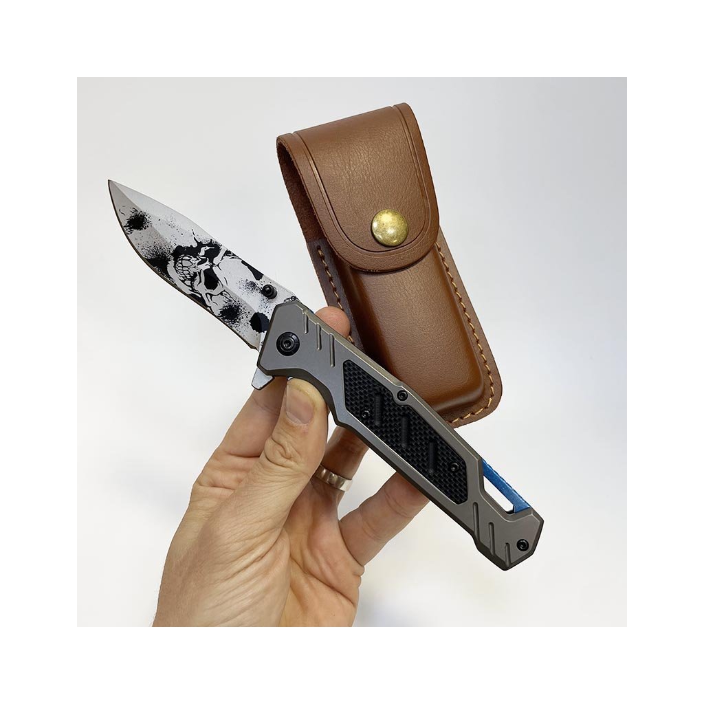 Stylový vyklápěcí nůž s malbou lebky na čepeli a koženým pouzdrem. Personalizujte ho vlastním textem či motivem. Skvělý dárek pro odvážné.