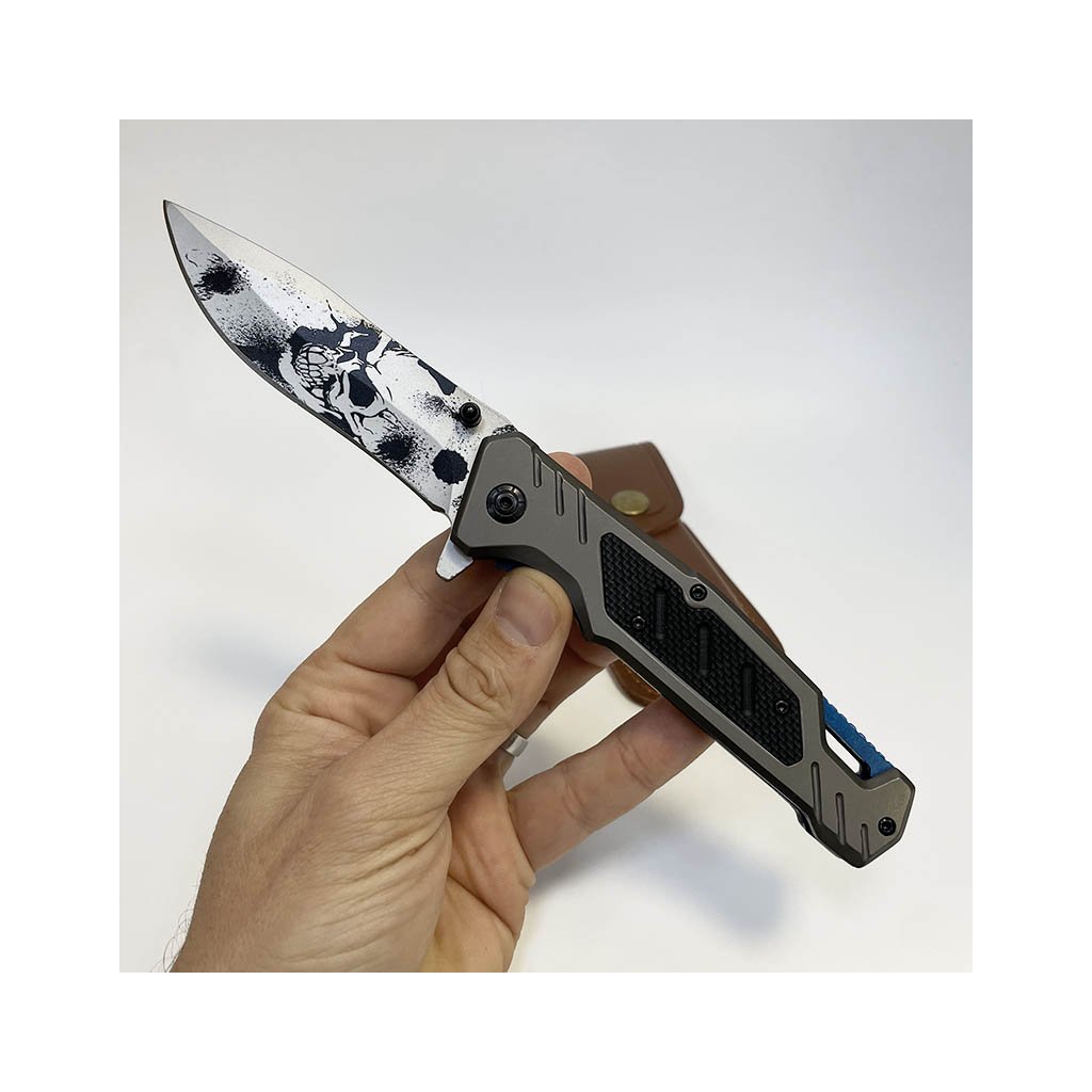 Moderní vyklápěcí nůž s malbou na čepeli LEBKA s možností koženého pouzdra s vlastním textem + prémiové dárkové balení BE Original