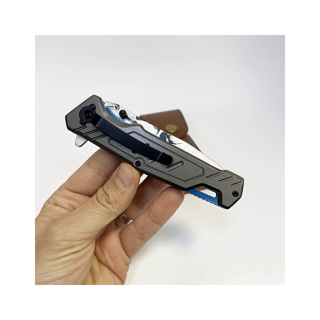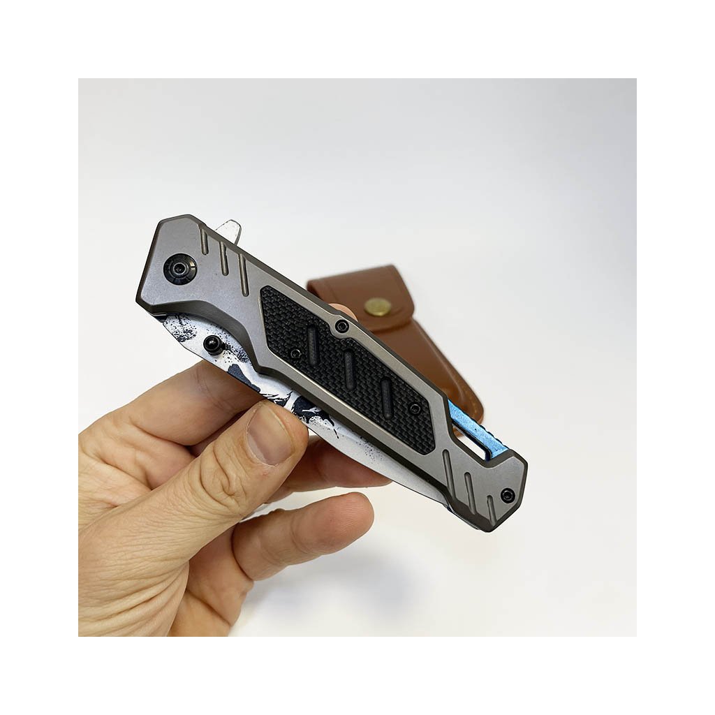 Prémiový vyklápěcí nůž s nádhernou malbou medvěda na čepeli. Včetně koženého pouzdra s možností gravírování textu, motivu či monogramu.