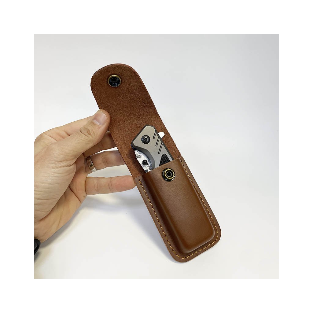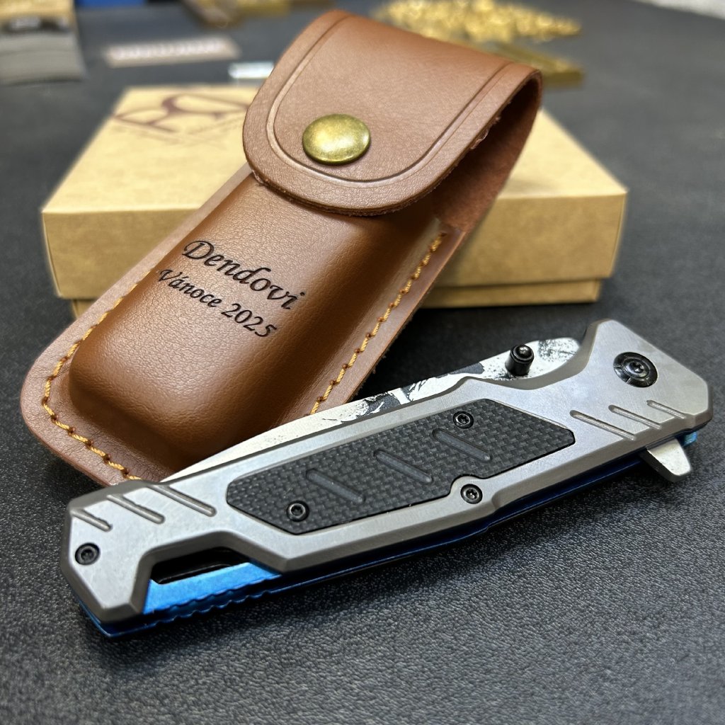 Moderní vyklápěcí nůž s čistým designem a koženým pouzdrem. Možnost gravírování vlastního textu či motivu přímo na pouzdro. Skvělý osobní dárek.