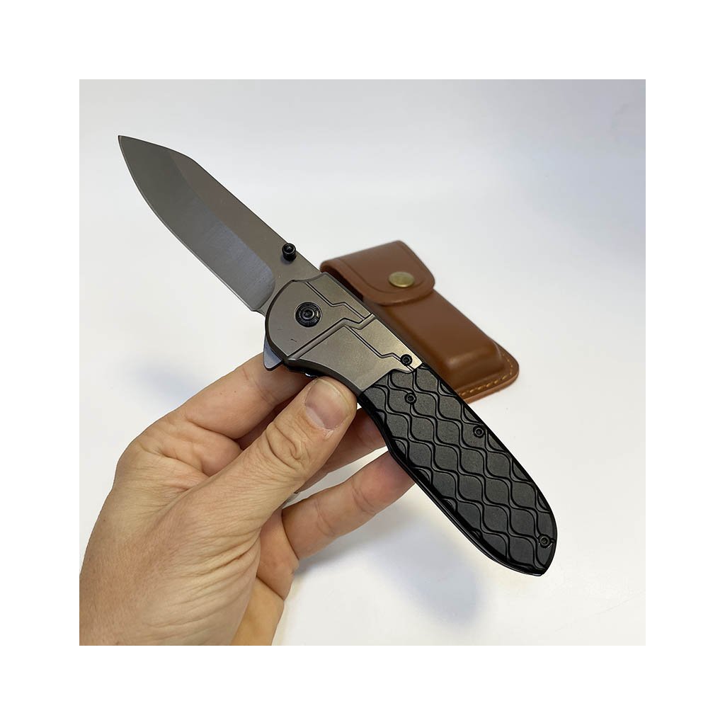 Nádherný kousek, extra kvalitní kovový vyklápěcí nůž, jednoduchý moderní design. Navíc včetně koženého pouzdra, na které lze vyhotovit jedinečný a originální motiv, text, monogram.