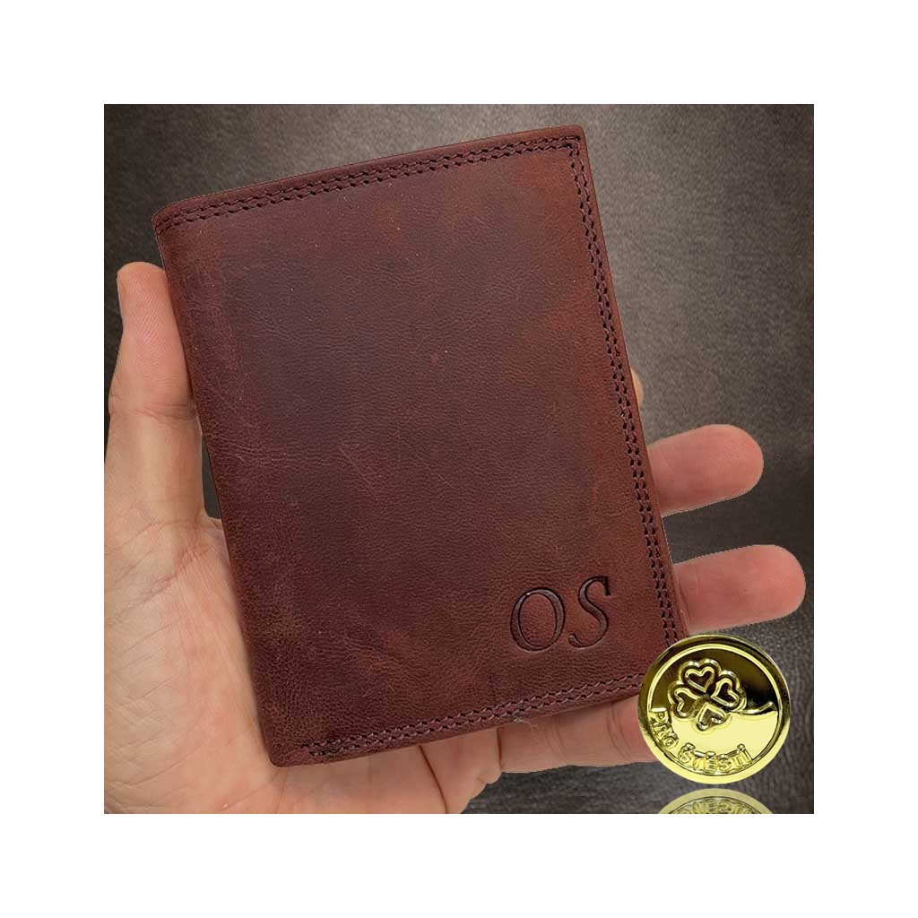 Pánská BORDO kožená peněženka Guru Leather s monogramem (ražba) + Akce - zlatá mince Pro štěstí ZDARMA