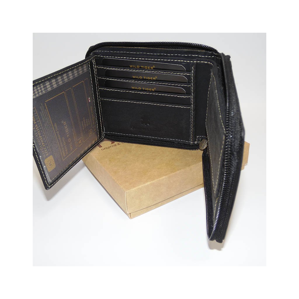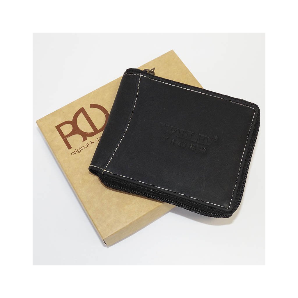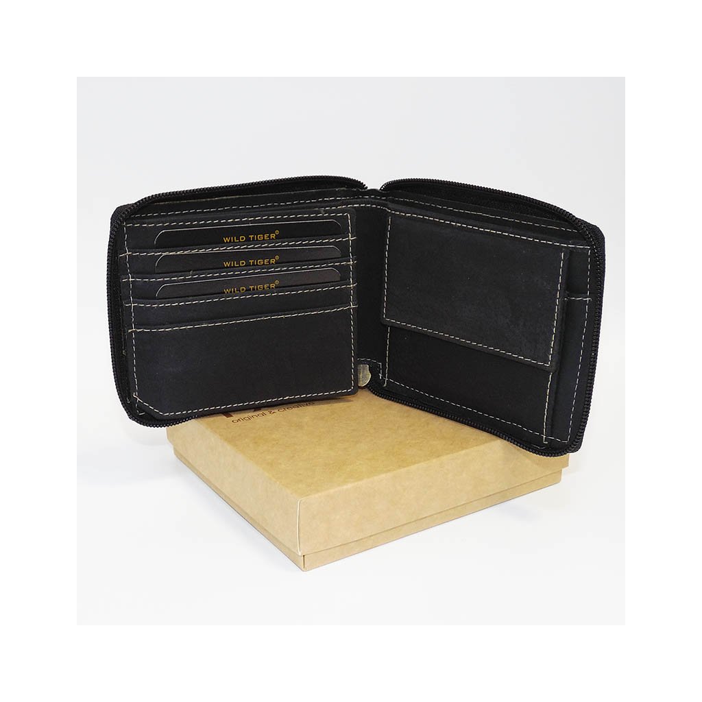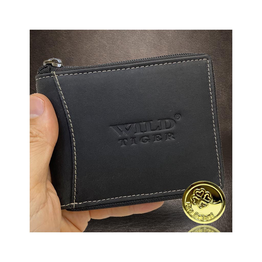 Pánská černá kožená peněženka Leon ZIPPER s monogramem a vlastním textem + Akce - zlatá mince Pro štěstí ZDARMA