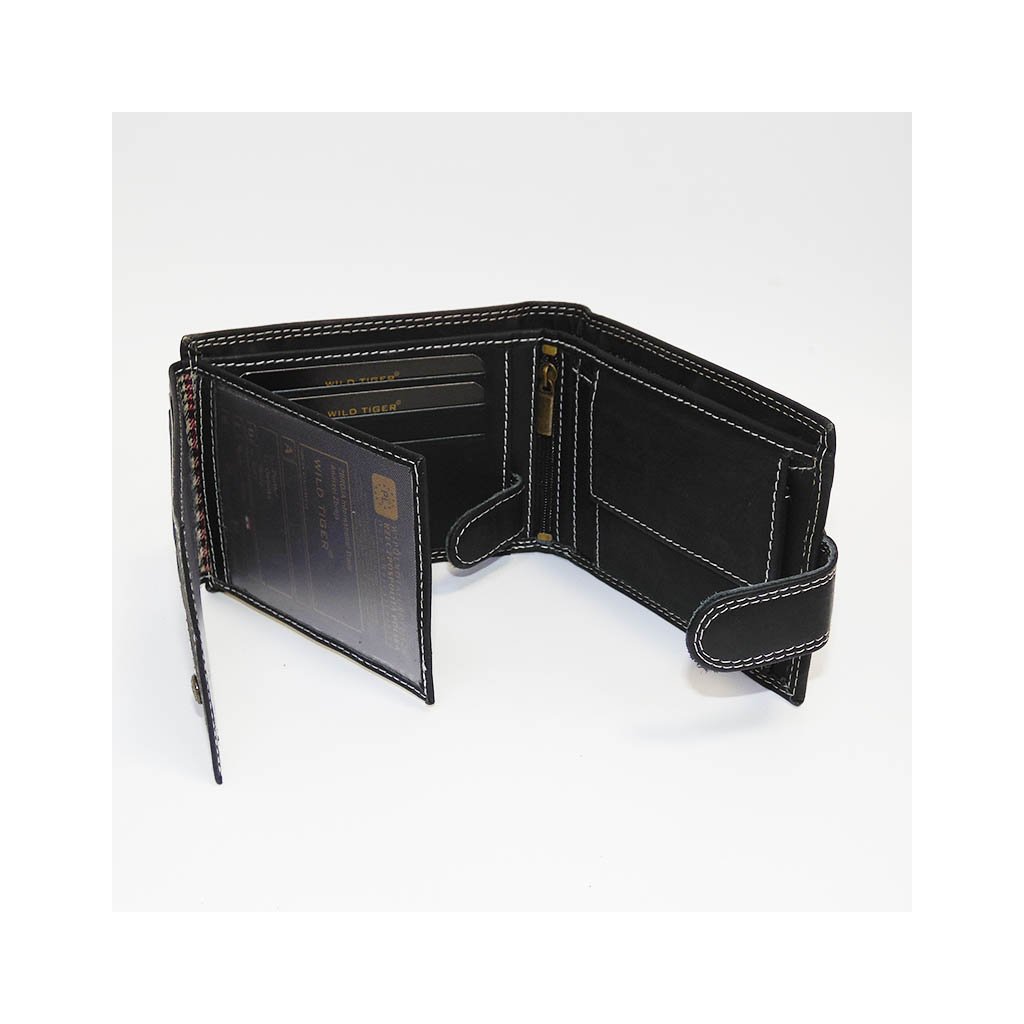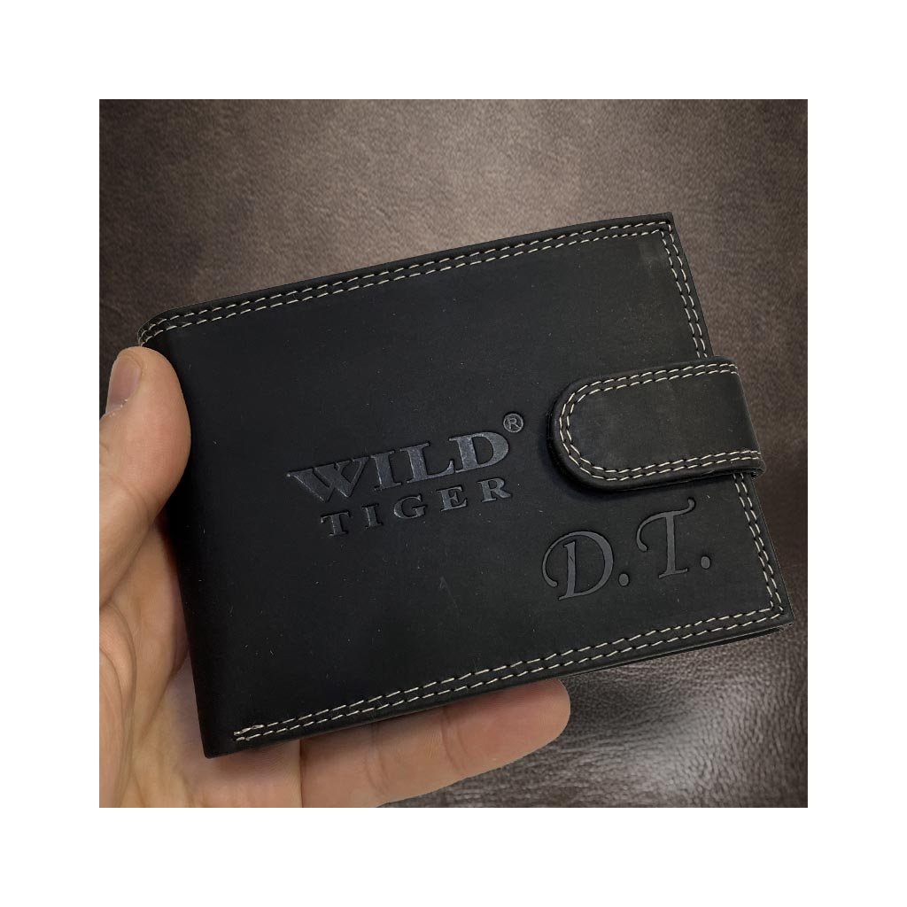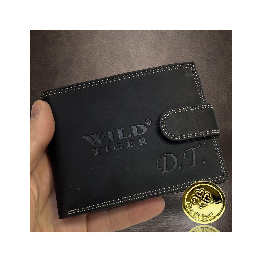 Pánská černá kožená peněženka Tiger Leather s monogramem (ražba) + Akce - zlatá mince Pro štěstí ZDARMA
