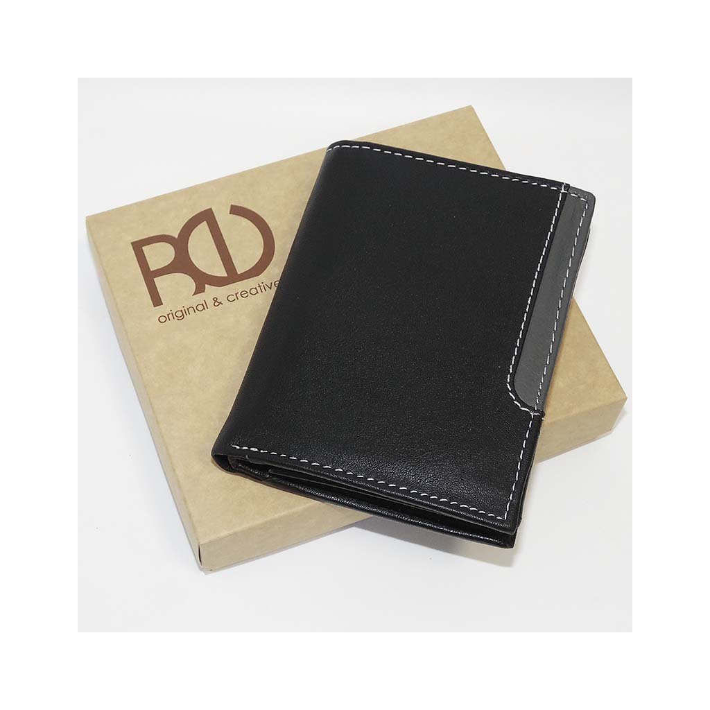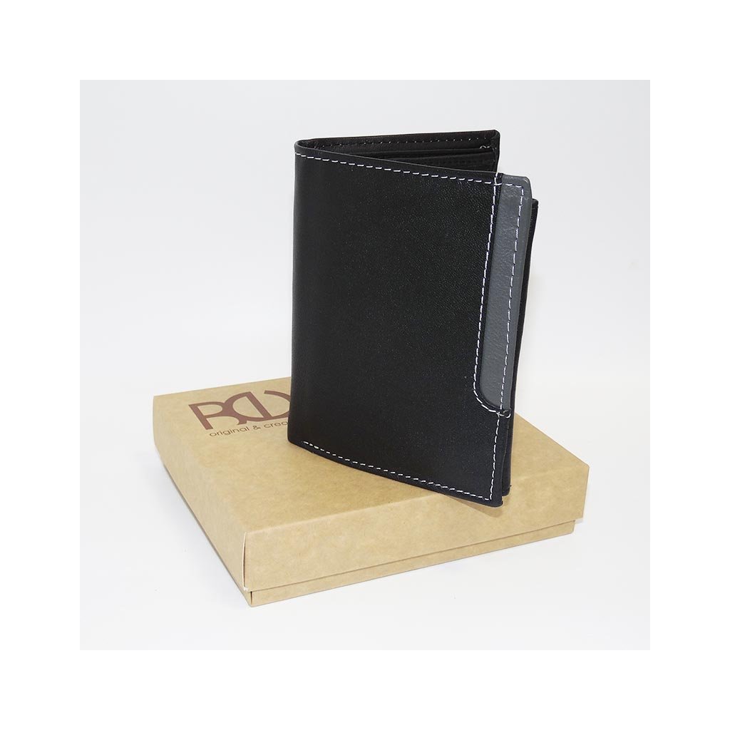 Tato černá pánská peněženka z měkčené kůže kombinuje klasický styl s moderním šedým designovým pruhem, který jí dodává nevšední a přesto elegantní charakter.