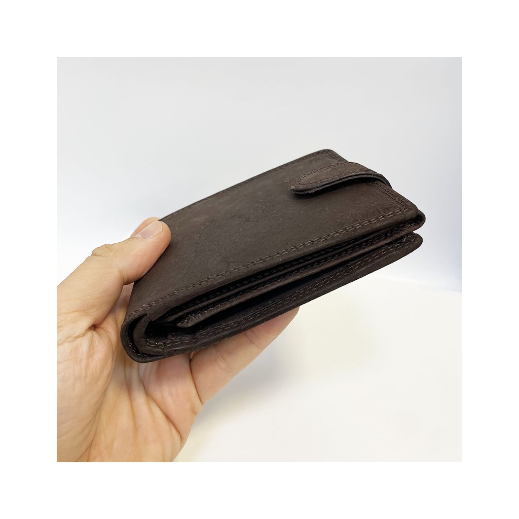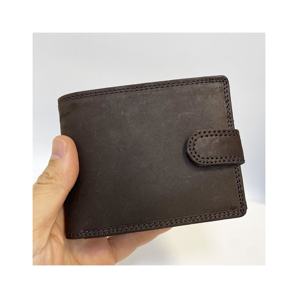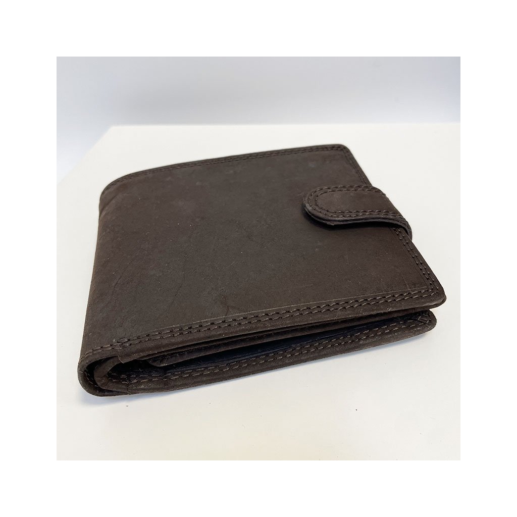 Stylová pánská tmavě hnědá peněženka GURU z broušené pravé kůže se zapínáním a monogramem