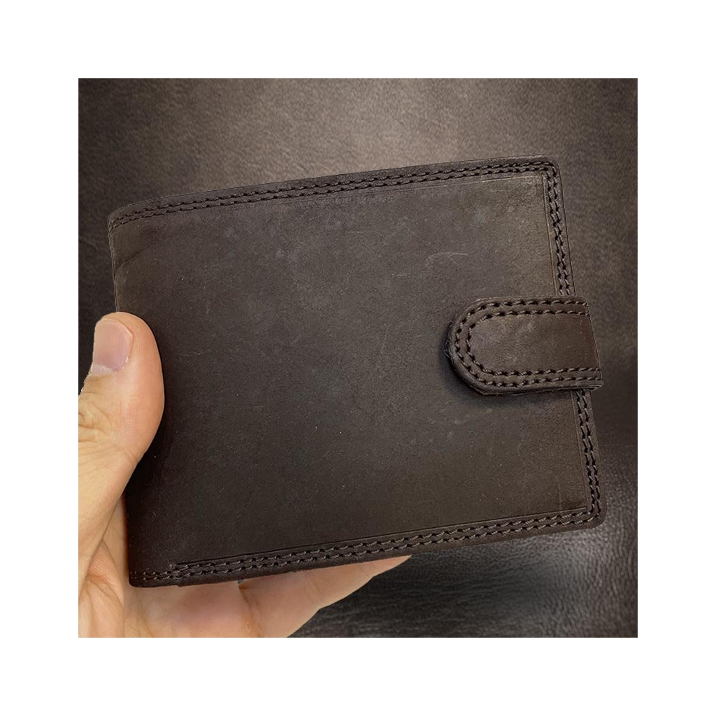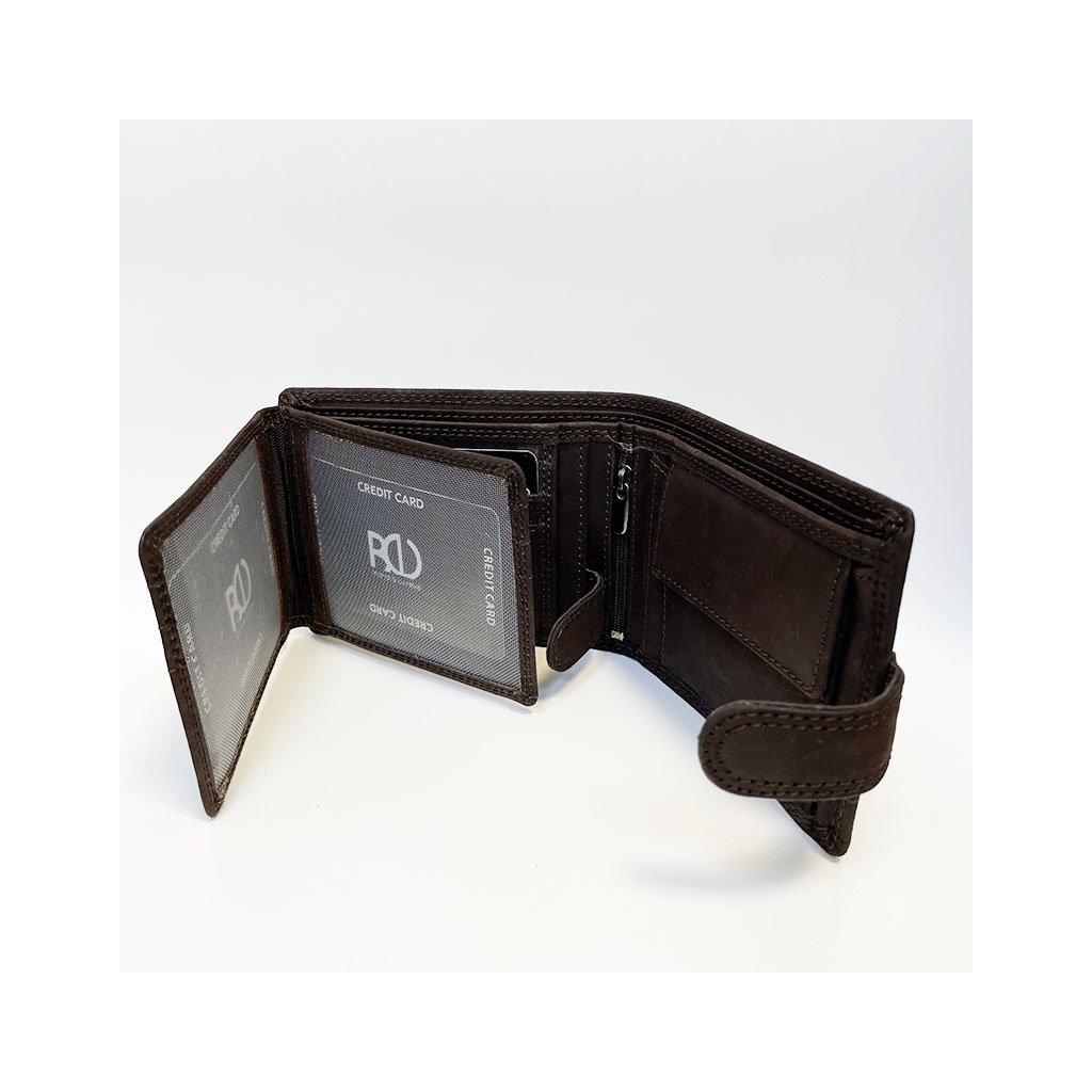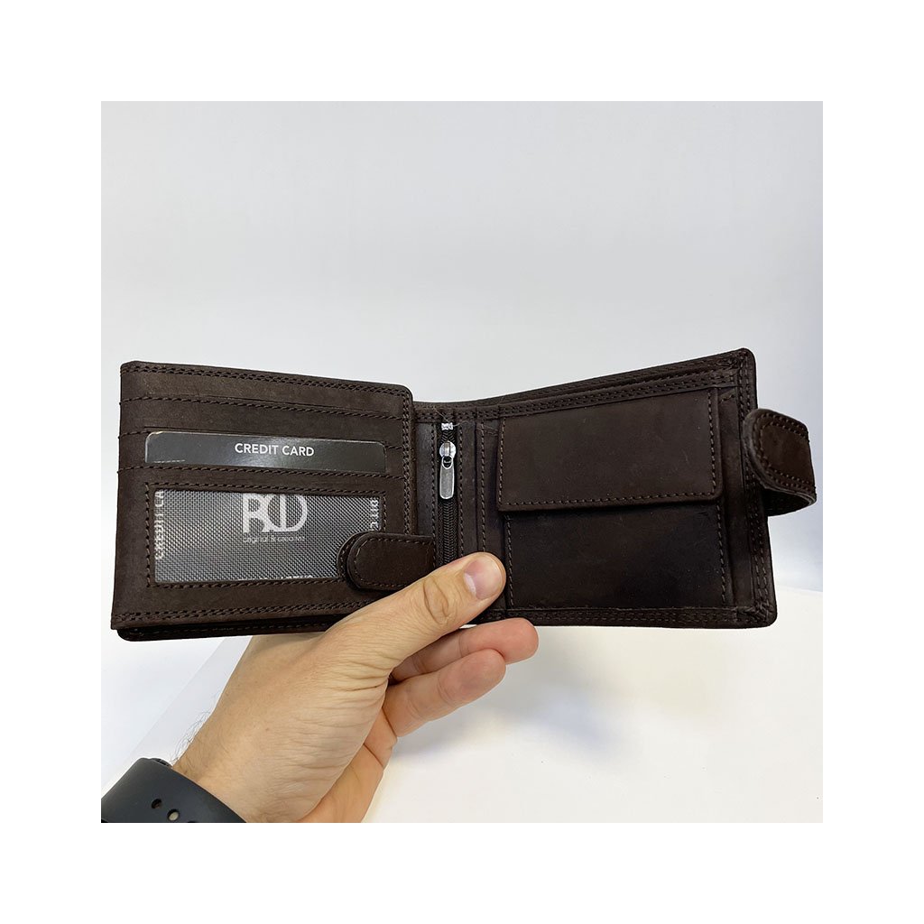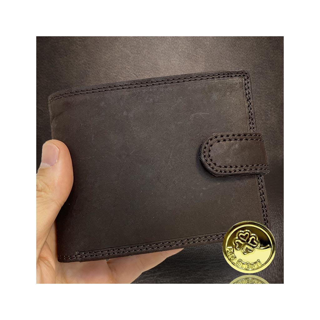 Stylová pánská tmavě hnědá peněženka GURU z broušené pravé kůže se zapínáním a monogramem