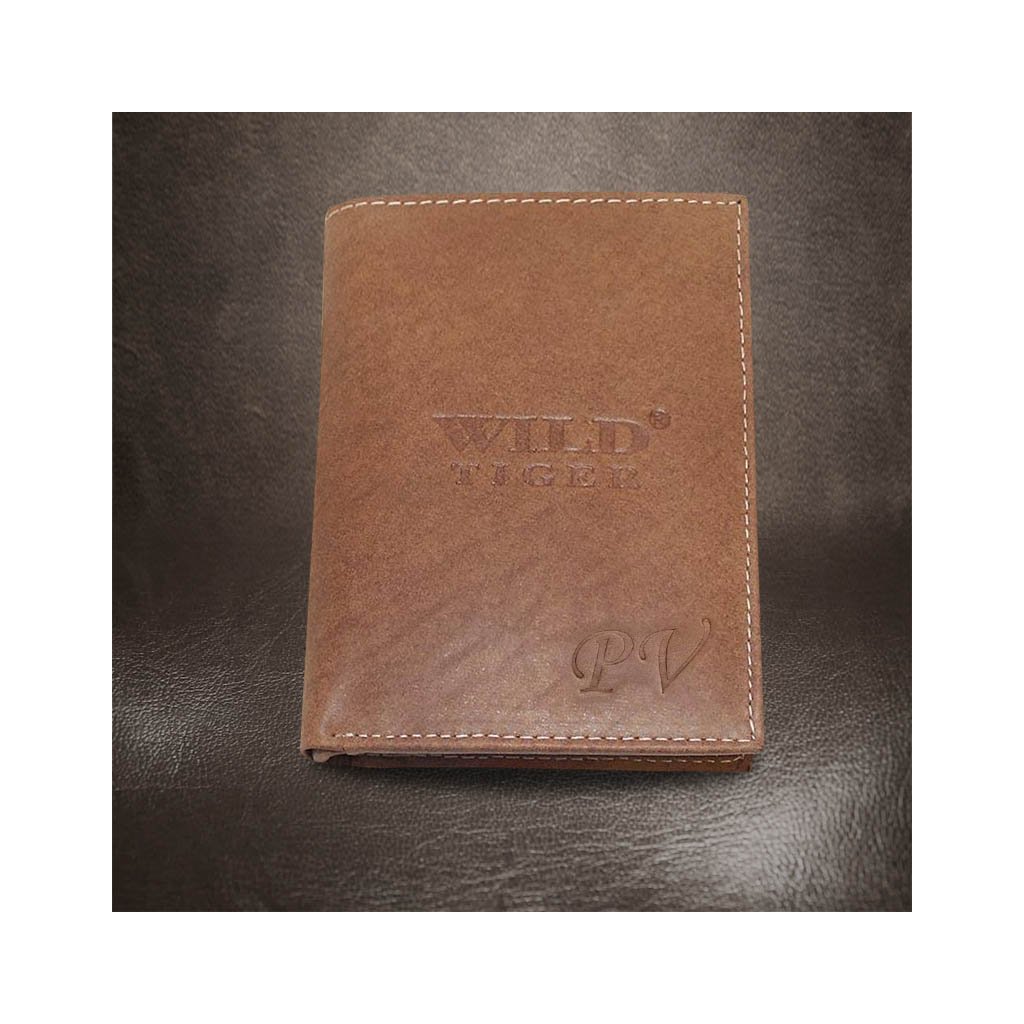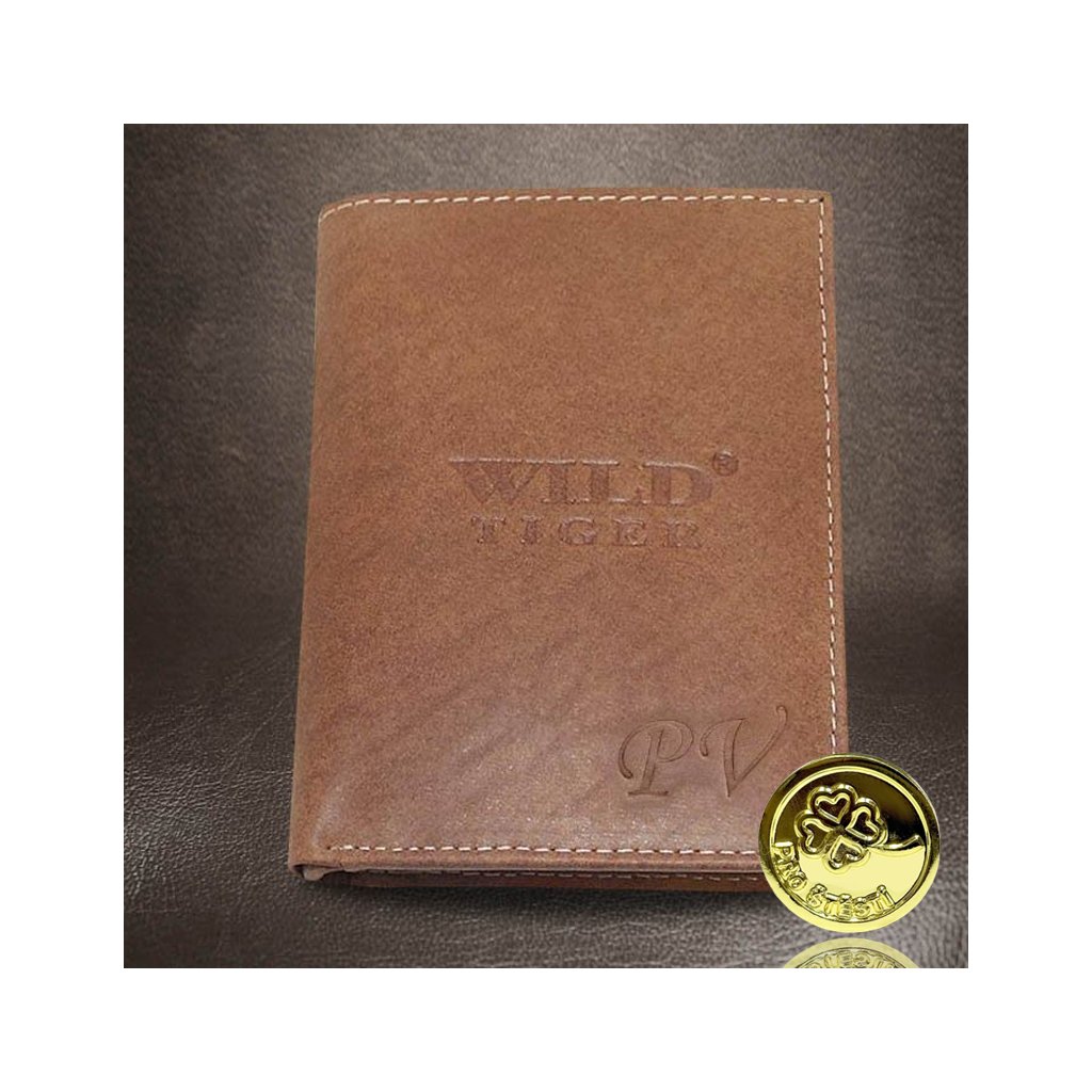 Pánská hnědá kožená peněženka Tiger Leather s monogramem (ražba) + Akce - zlatá mince Pro štěstí ZDARMA
