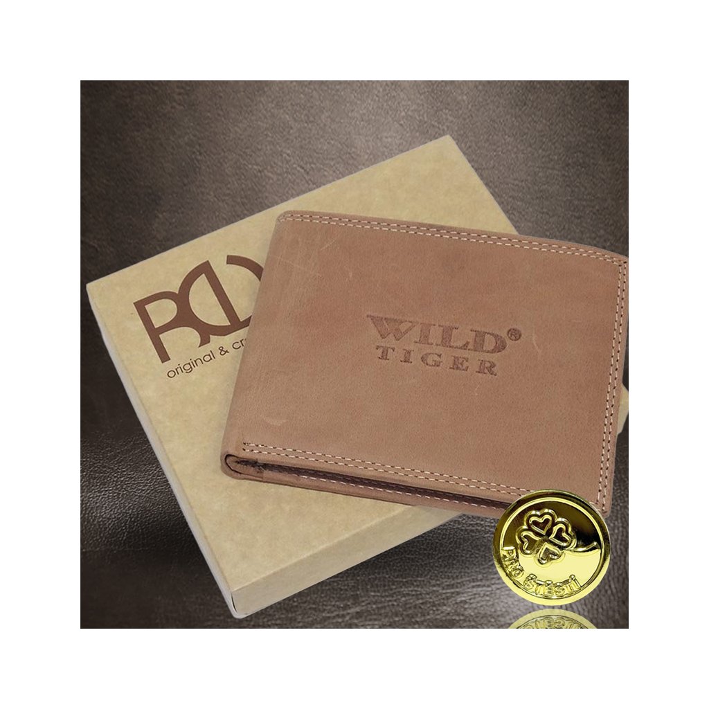 Pánská hnědá kožená peněženka Tiger Leather s monogramem (ražba) + Akce - zlatá mince Pro štěstí ZDARMA