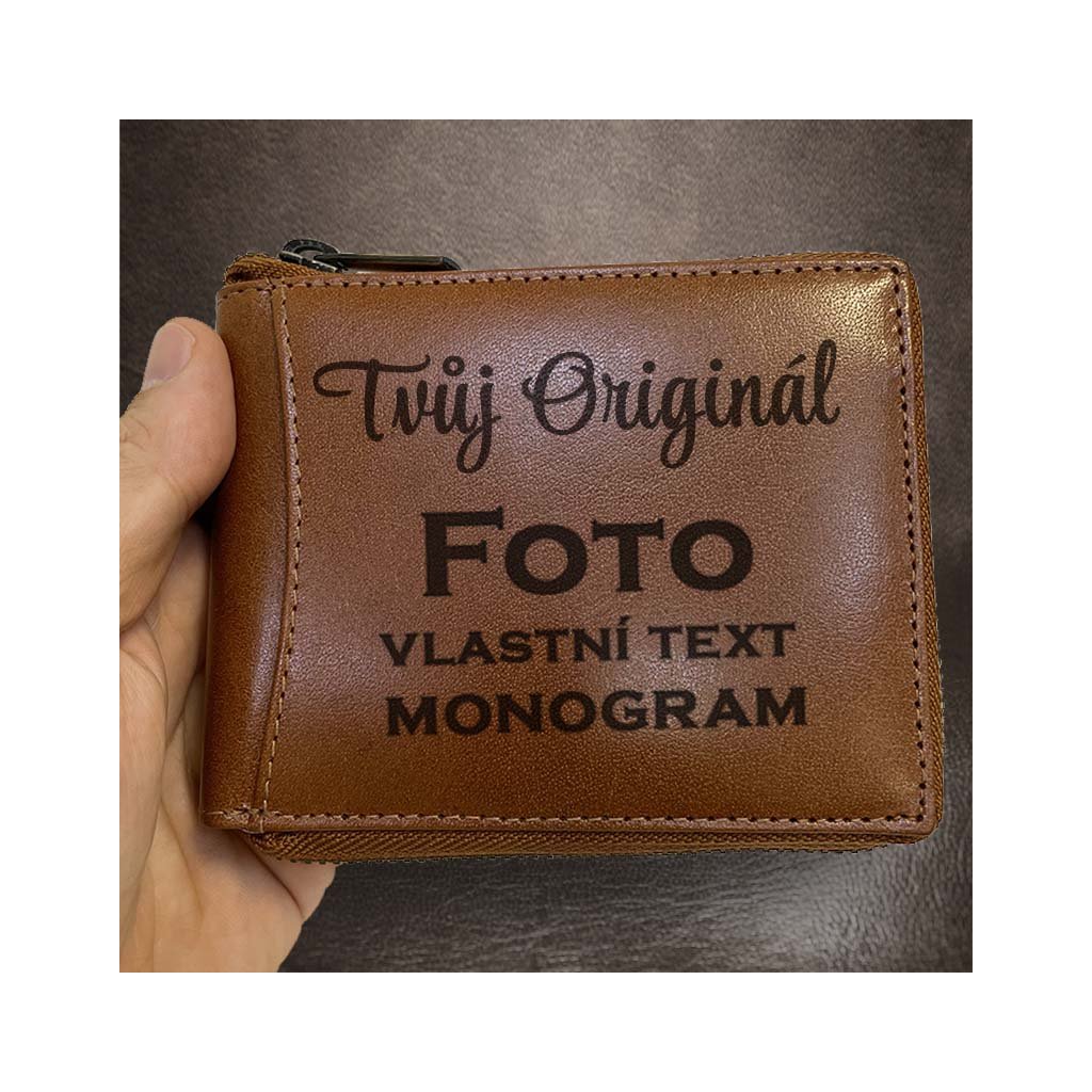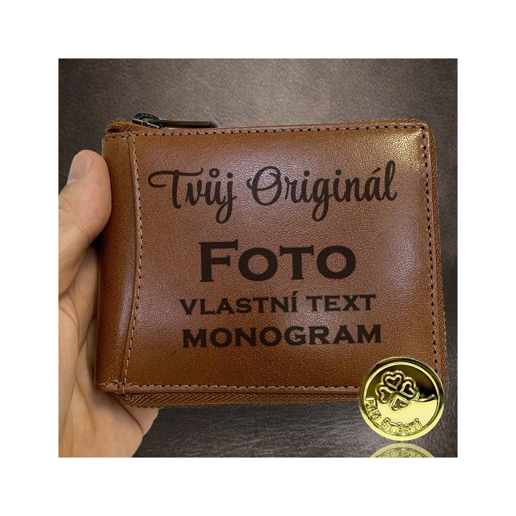 Pánská hnědá kožená peněženka ZIPPER ROYAL Leather s monogramem, textem nebo fotkou + Akce - zlatá mince Pro štěstí ZDARMA