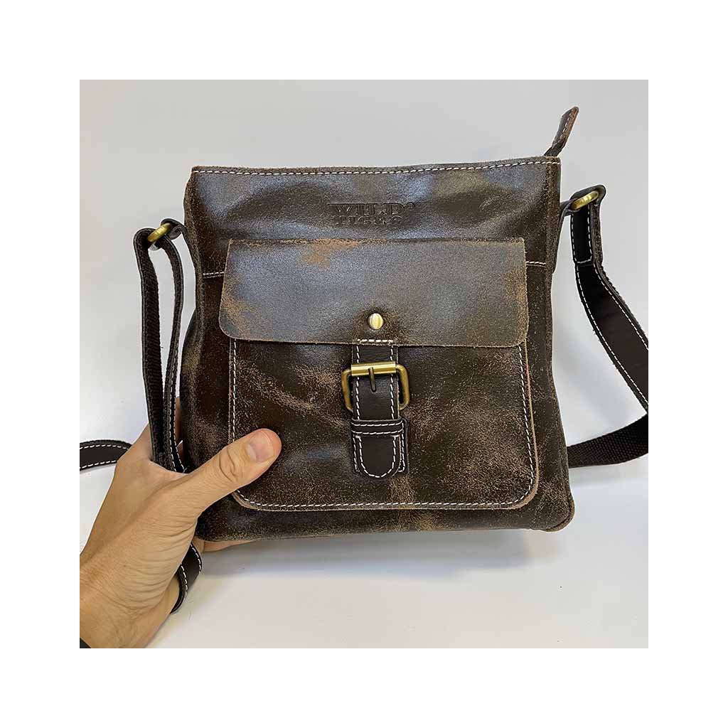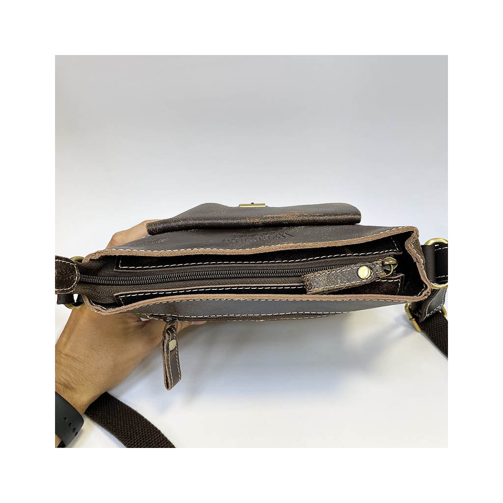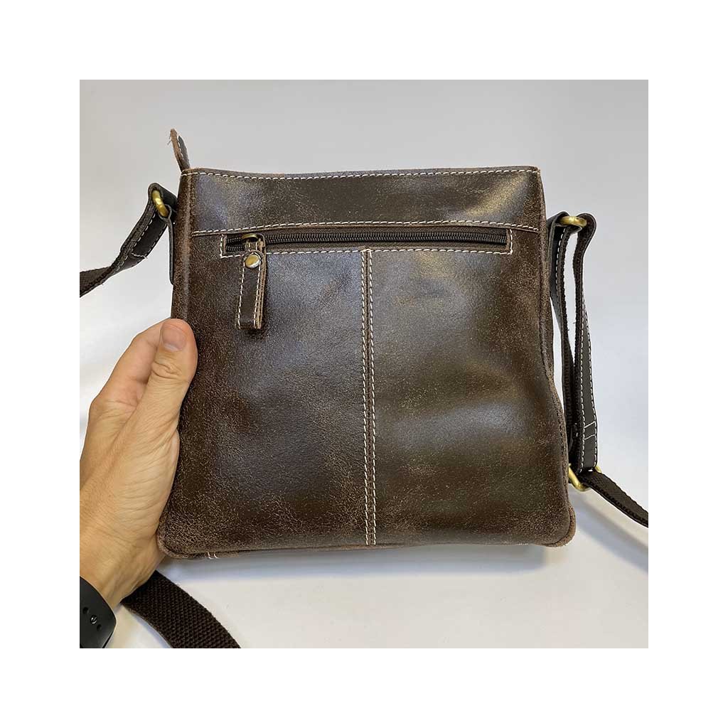 Crossbody kožená messenger taška je v naturálním broušeném hnědém odstínu. Přední kapsa na klip má vkusný magnetek, který opravdu velmi dobře drží. Vrchní část tašky je na zip, po otevření máte další kapsu a vnitřní klasické uspořádání, výhodou i je zadní kapsa opět na zip. Taška má kvalitní nastavitelný popruh.