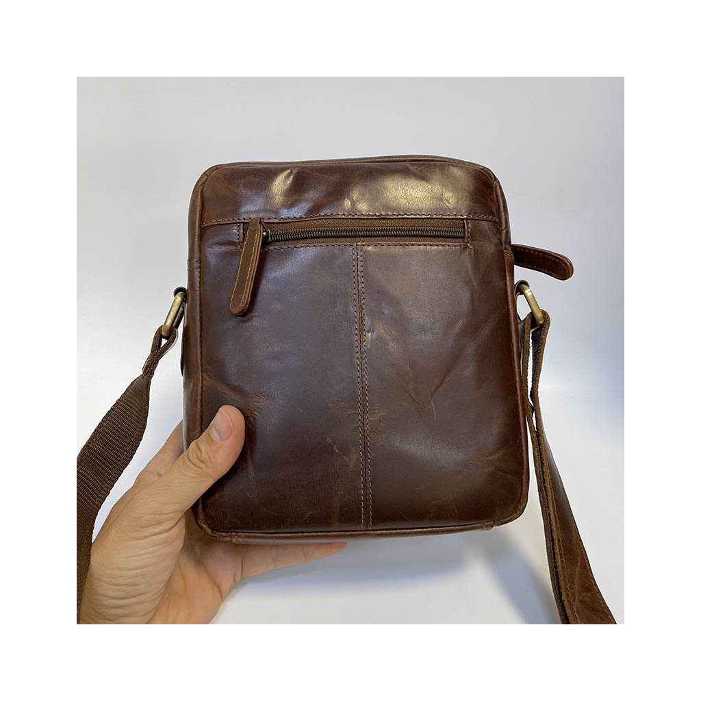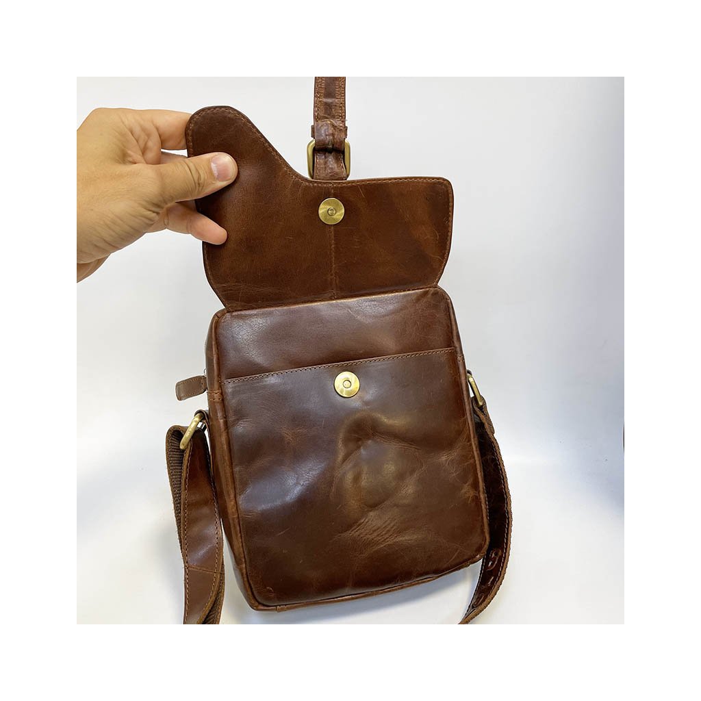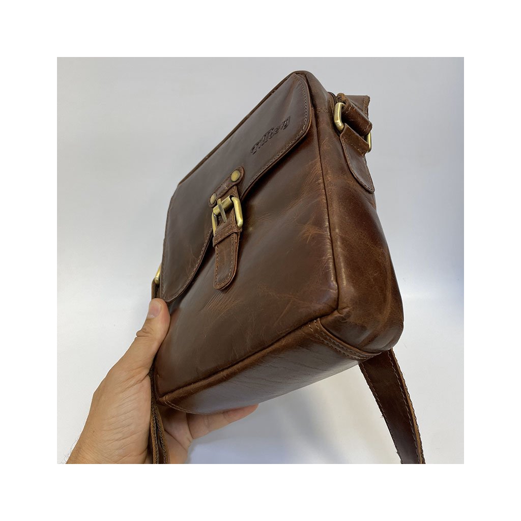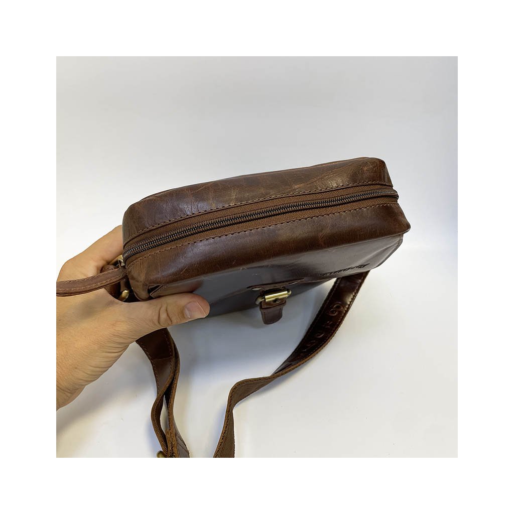 Crossbody kožená messenger taška je v úžasném tmavě hnědém odstínu. Přední odklápěcí část na magnet, kapsa, zadní kapsa. Celá taška má hlavní kapsu na zip, je středně velkých rozměrů, ideální na cestování, kdy do ní dáte s přehledem vše nezbytné. Součástí je nastavitelný popruh.