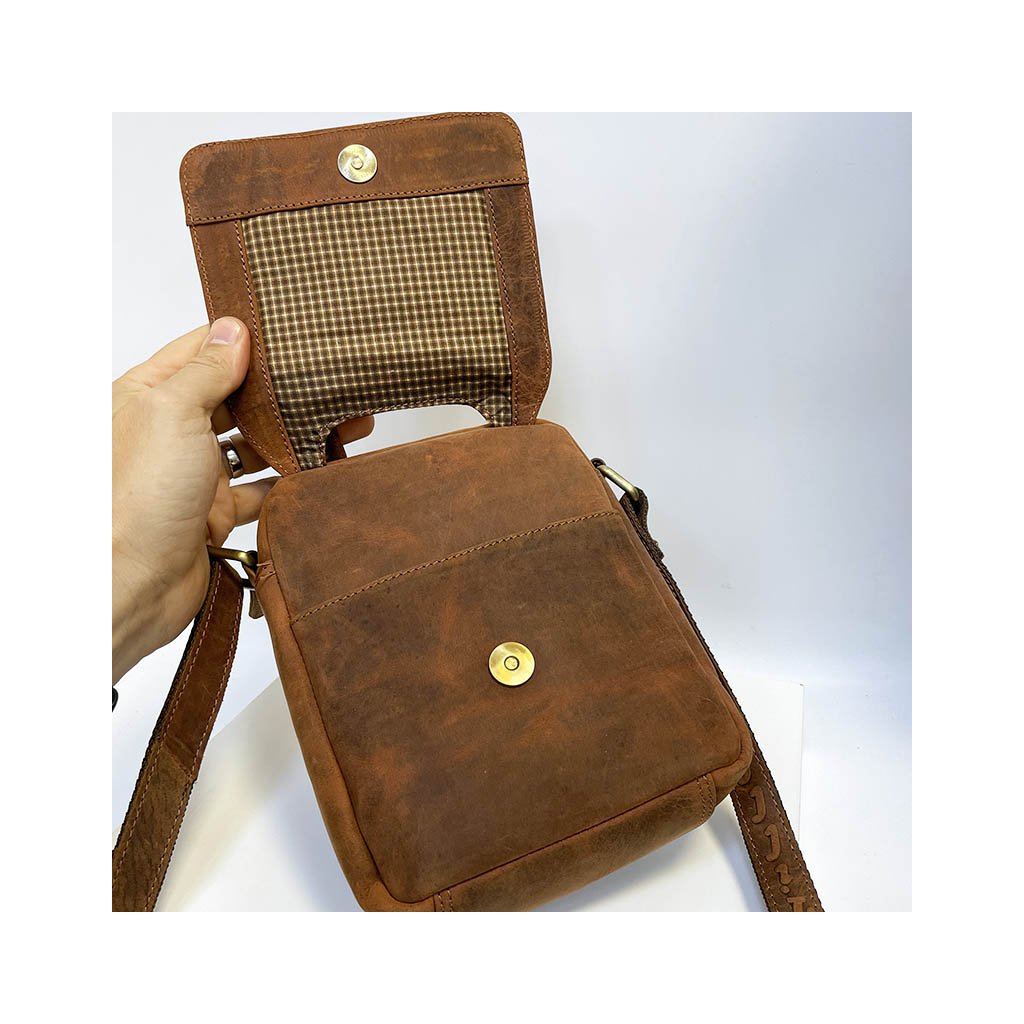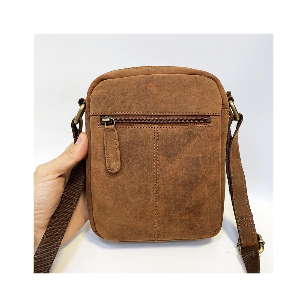 Crossbody kožená messenger taška je v úžasném hnědém odstínu. Přední kapsa na zip. Celá taška má dvě hlavní kapsy na zip, je menších rozměrů, ideální na cestování, kdy do ní dáte s přehledem vše nezbytné. Součástí je nastavitelný popruh.