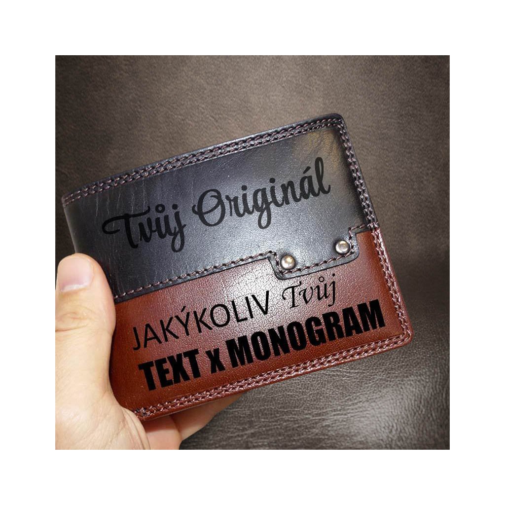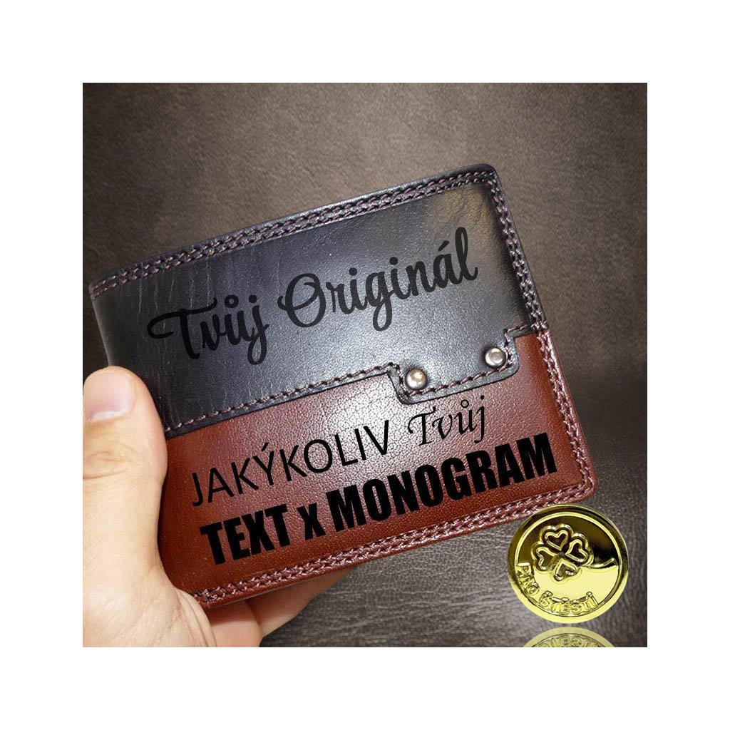 Pánská hnědo černá kožená peněženka PREMIUM RFID Leather s monogramem a vlastním textem + Akce - zlatá mince Pro štěstí ZDARMA