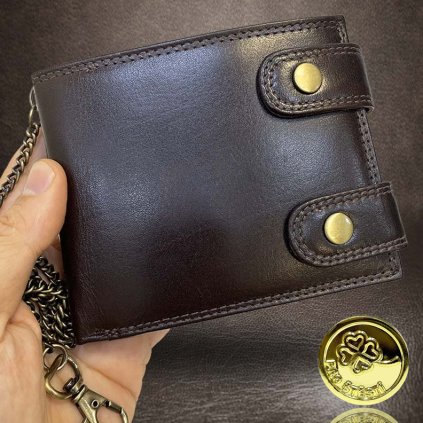 Tato peněženka z kolekce Premium Leather je šitá s maximálním důrazem na kvalitu a detaily. Kombinuje pevné dvojité zapínání na druk s řetězem a karabinou, takže skvěle drží a je ideální nejen pro rockery či motorkáře, ale pro každého, kdo chce peněženku, která vydrží a vypadá stylově.