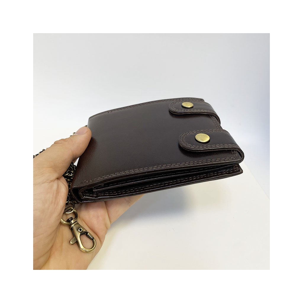 Tato peněženka z kolekce Premium Leather je šitá s maximálním důrazem na kvalitu a detaily. Kombinuje pevné dvojité zapínání na druk s řetězem a karabinou, takže skvěle drží a je ideální nejen pro rockery či motorkáře, ale pro každého, kdo chce peněženku, která vydrží a vypadá stylově.