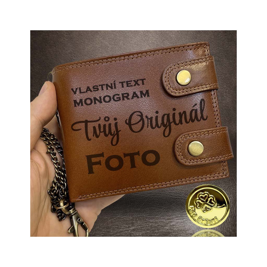 Pánská kožená peněženka s řetízkem ROYAL Leather RFID s monogramem, textem nebo fotkou + Akce - zlatá mince Pro štěstí ZDARMA