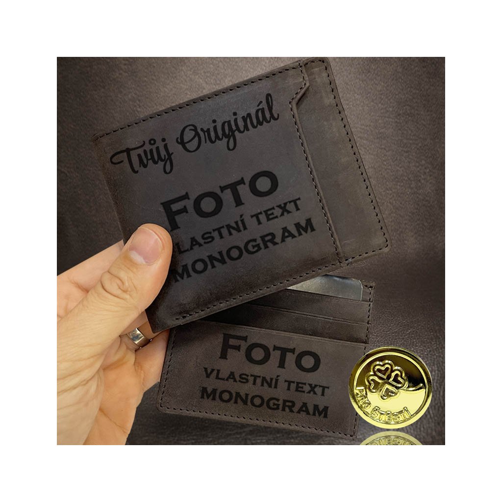 Pánská luxusní kožená SLIM peněženka 2v1 tmavě hnědá s monogramem, textem nebo fotkou + Akce - zlatá mince Pro štěstí ZDARMA
