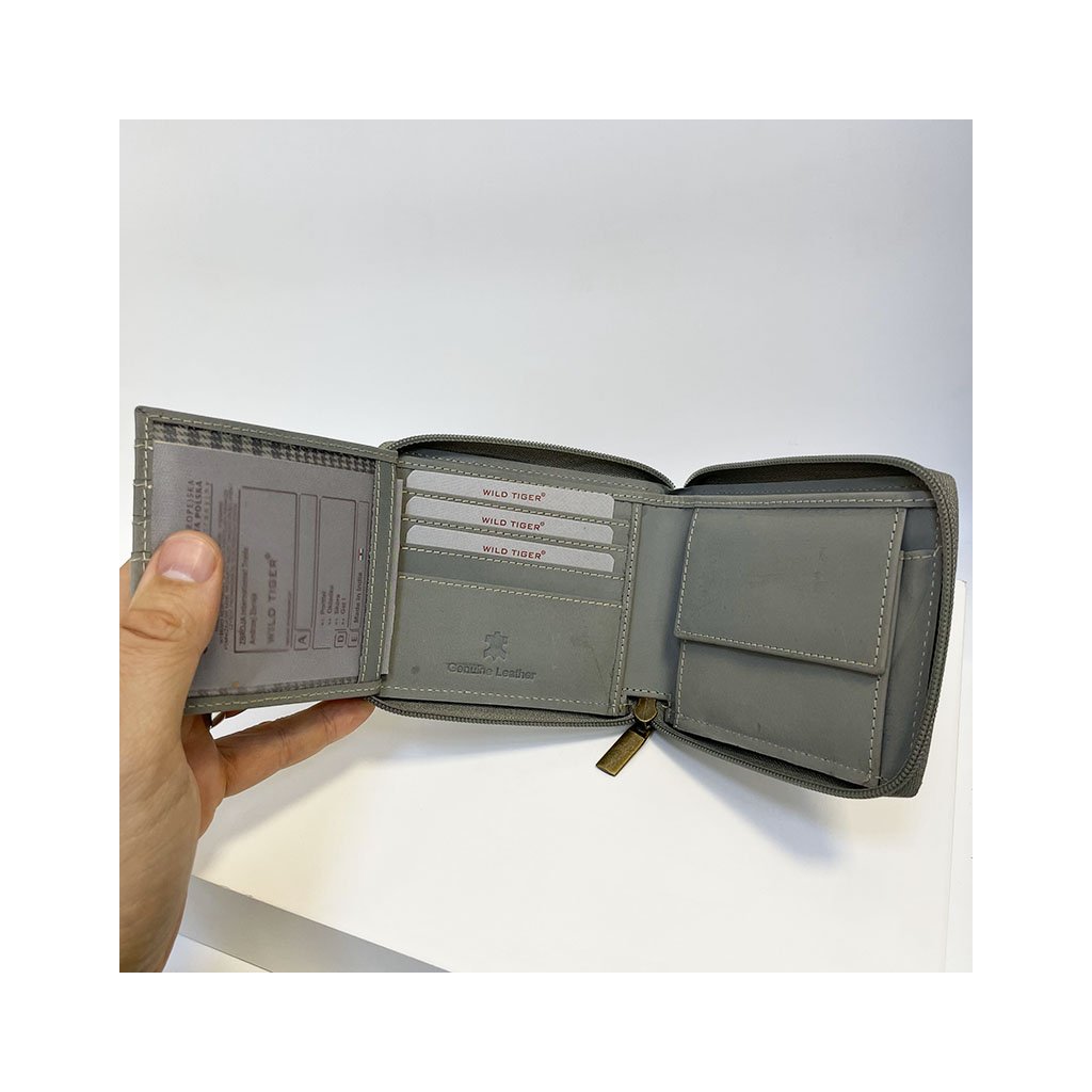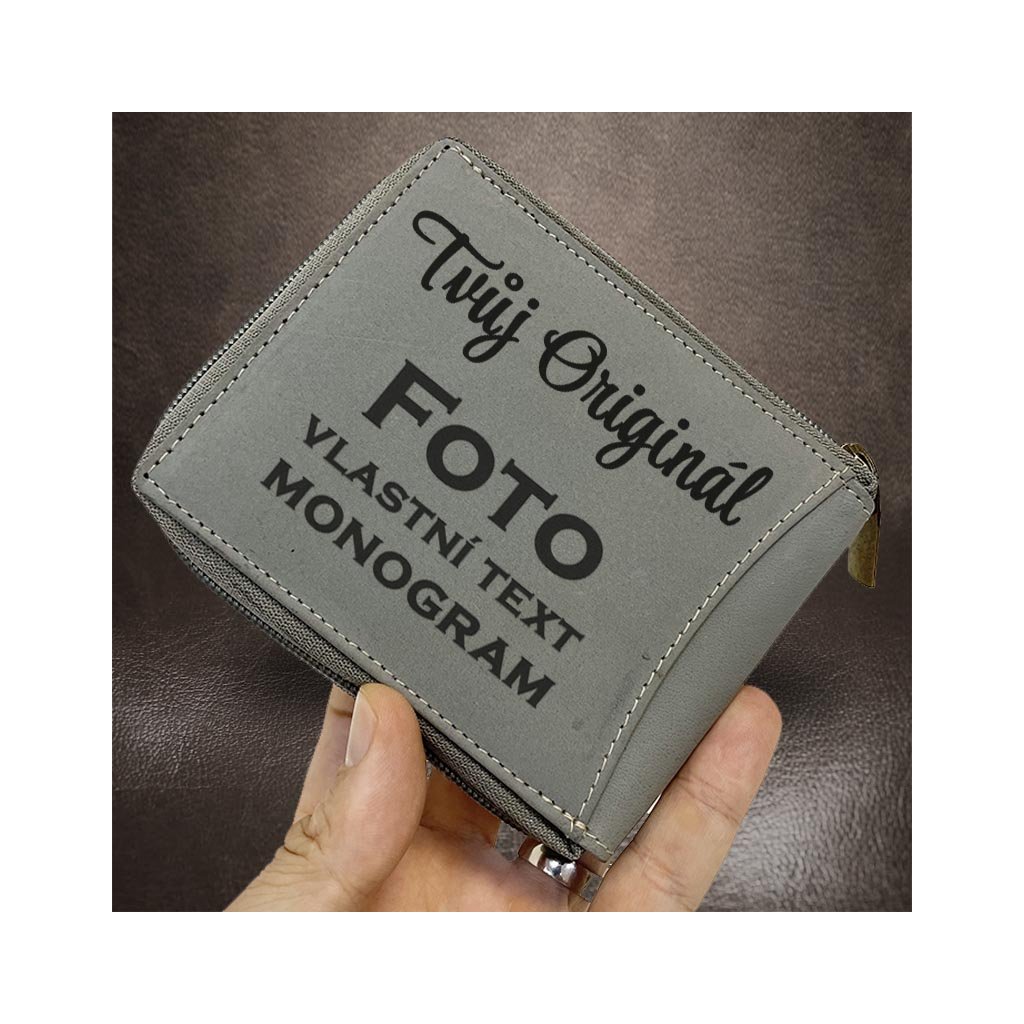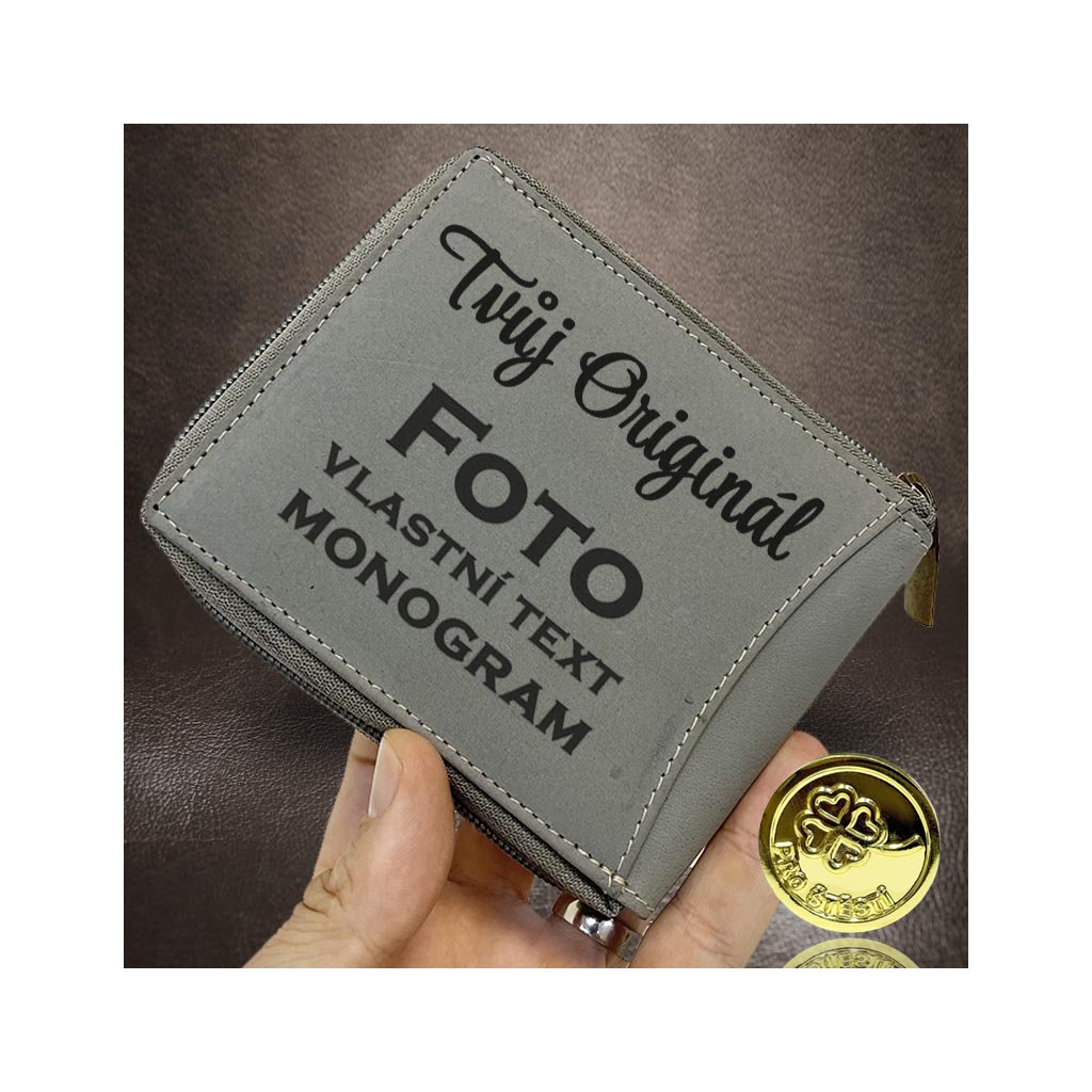 Pánská šedá kožená peněženka celá na zip Tiger Leather s monogramem a vlastním textem + Akce - zlatá mince Pro štěstí ZDARMA