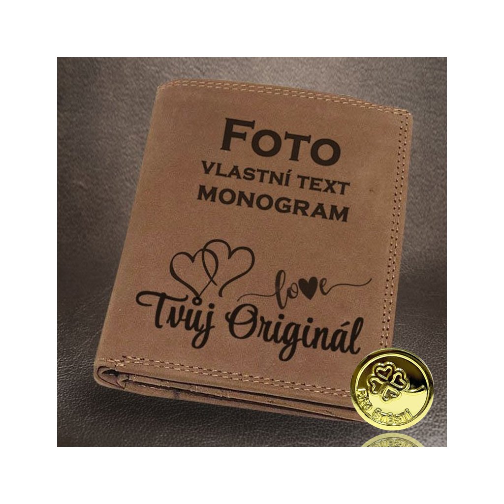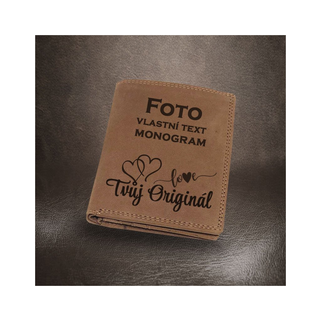 Díky moderním technologiím umíme peněženku ozdobit laserovým gravírováním – od krátkého textu, citátu, loga až po jednoduchý obrázek nebo fotku. Výsledkem je osobitý doplněk nebo nezapomenutelný dárek přesně na míru.