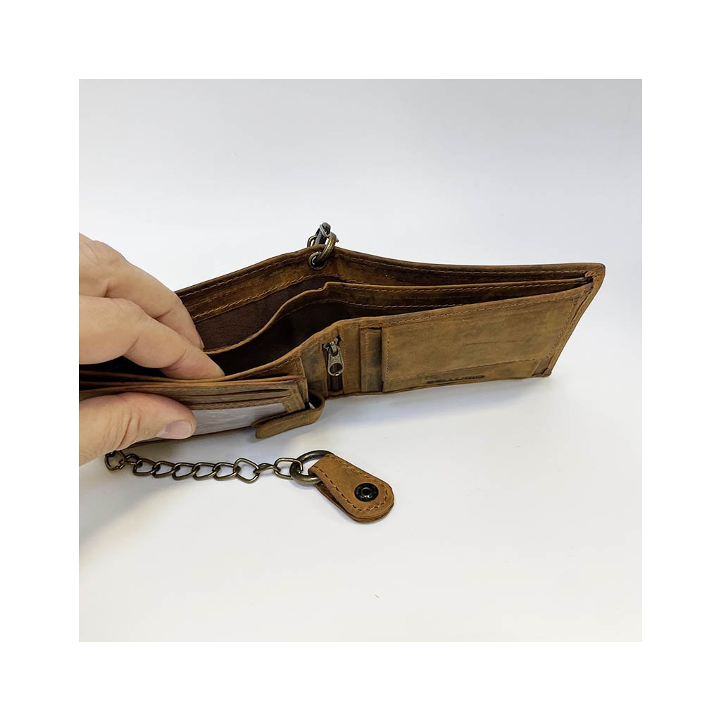 Peněženka je vyrobena z prémiové hovězí kůže, doplněna masivním kovovým řetízkem s karabinou. Praktické dvojité zapínání, dostatek prostoru uvnitř, kapsa na mince i RFID...