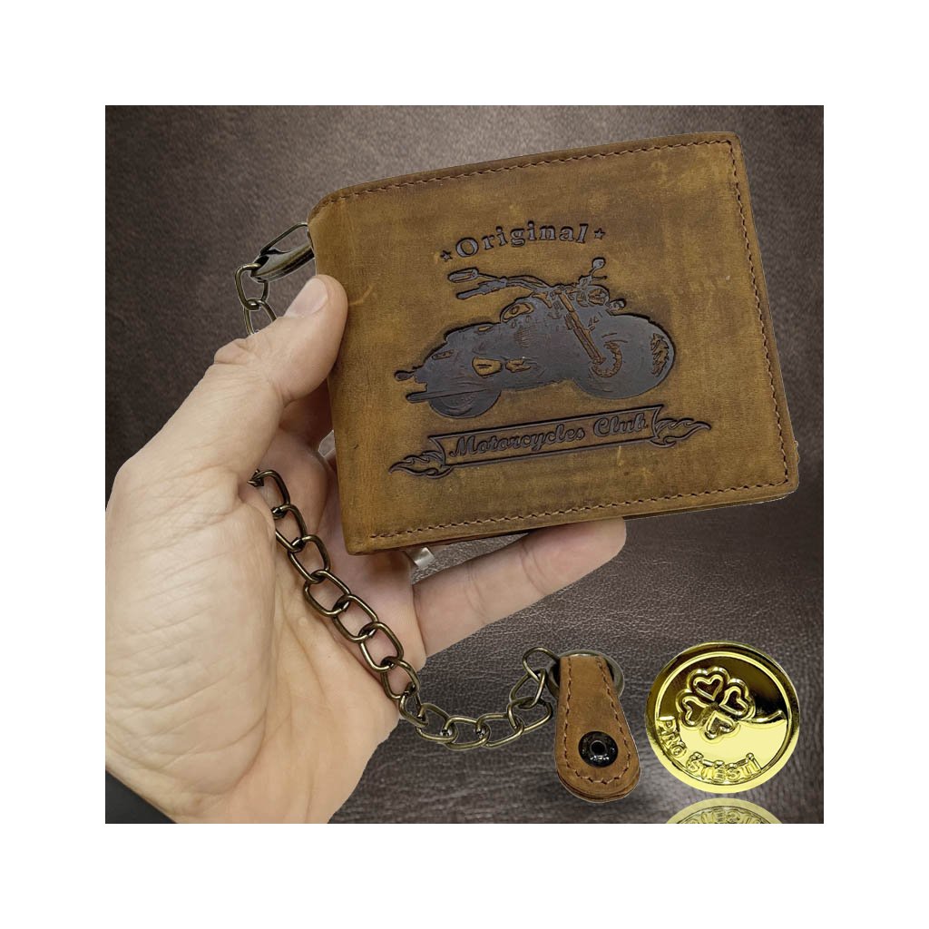 Pánská světle hnědá kožená peněženka s MOTORKOU a řetízkem BELLUGIO Leather + Akce - zlatá mince Pro štěstí ZDARMA