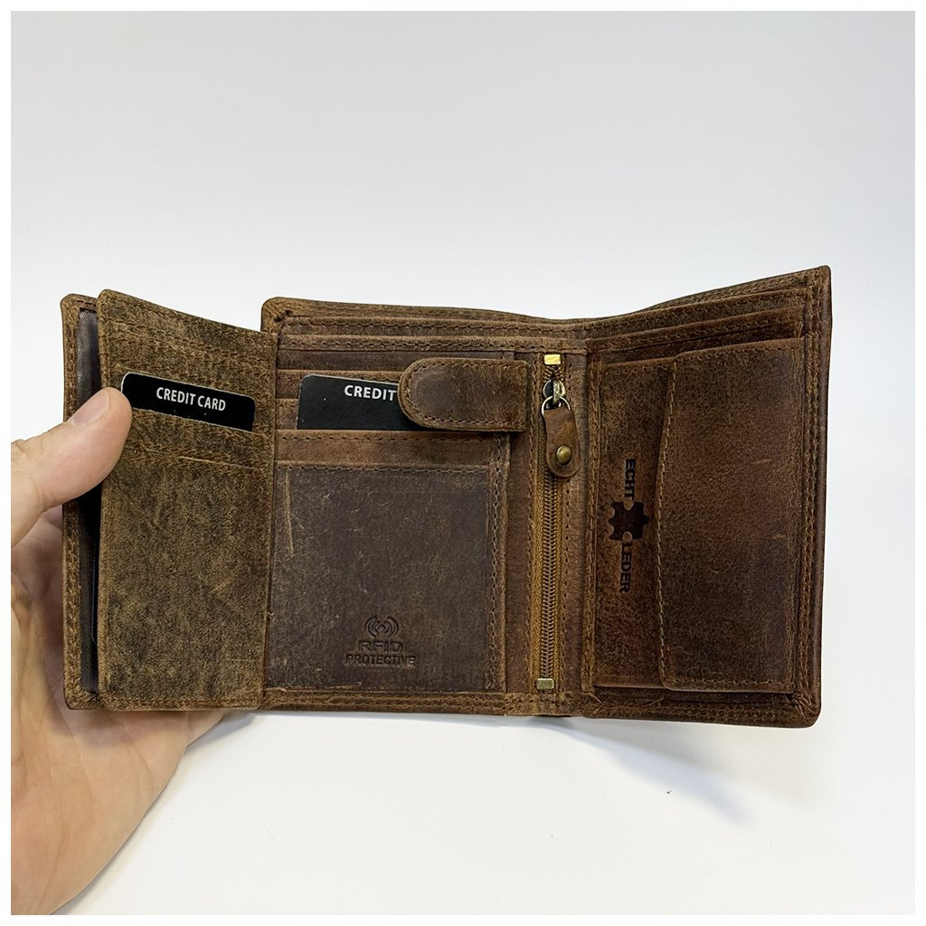 Elegantní pánská peněženka HUNTER v tmavě hnědém odstínu je ideální volbou pro muže, kteří hledají kombinaci kvality, nadčasového designu a osobitého stylu. Tato kožená peněženka z pravé kůže vyniká precizním zpracováním, dlouhou životností a luxusním vzhledem, který podtrhne Váš každodenní outfit.