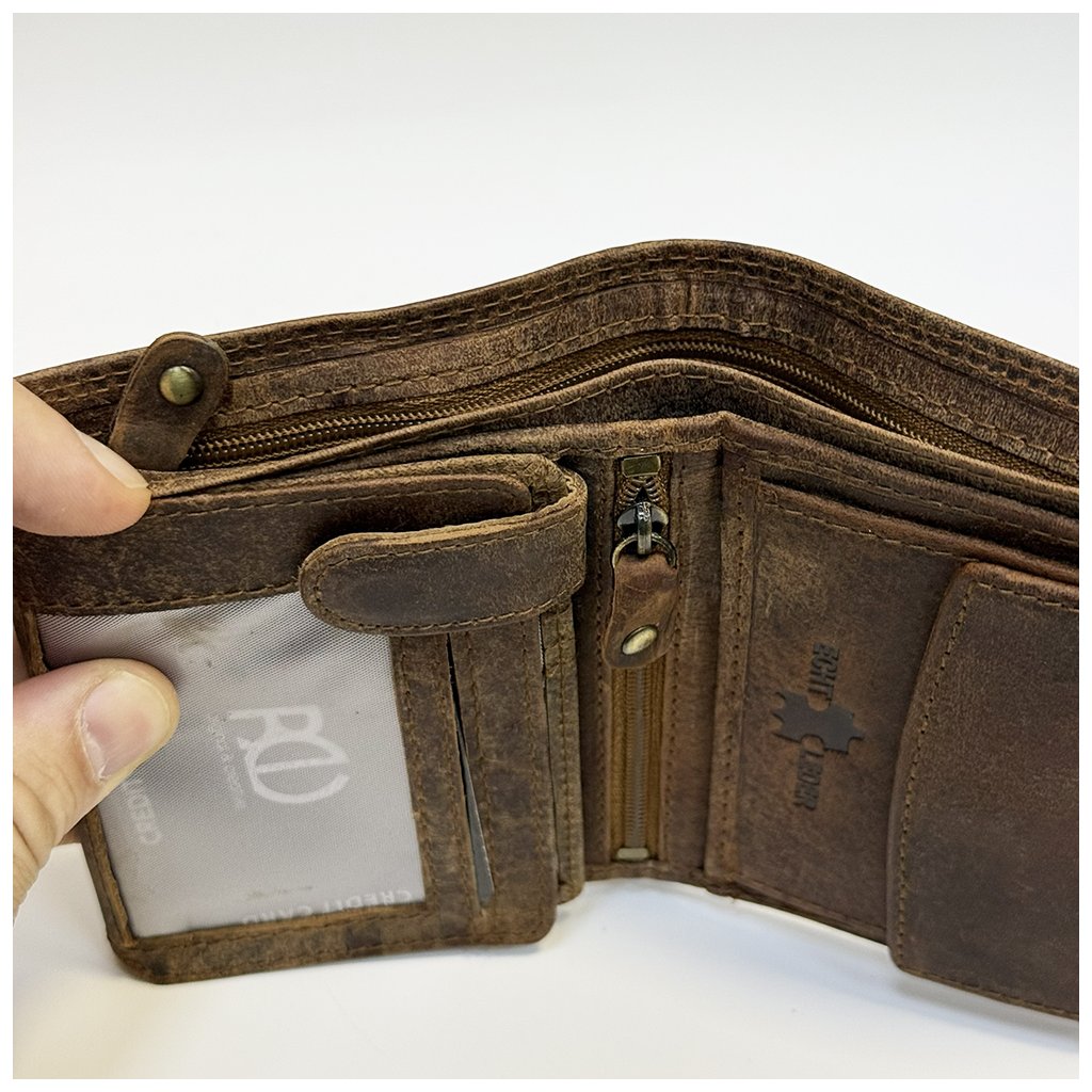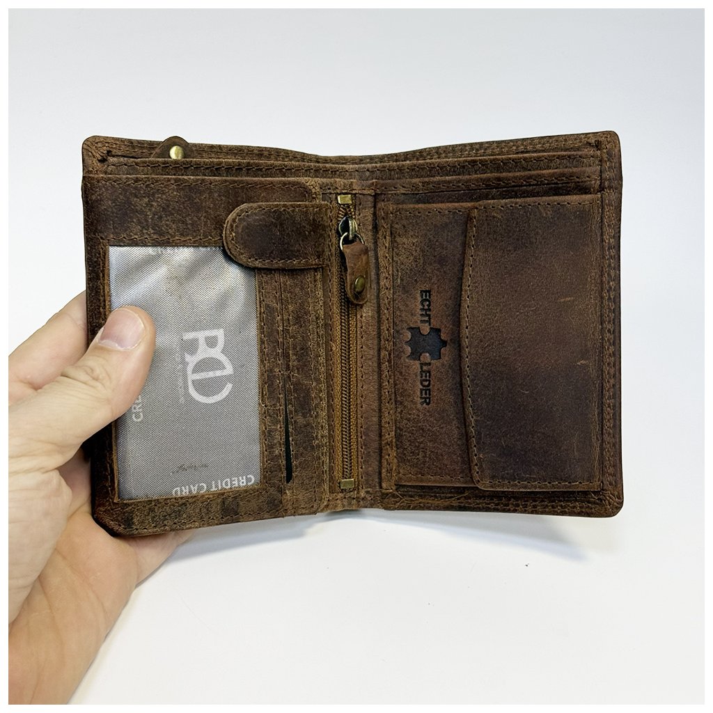 Peněženka je vyrobena z prémiové hovězí kůže, doplněna masivním kovovým řetízkem s karabinou. Praktické dvojité zapínání, dostatek prostoru uvnitř, kapsa na mince i RFID...