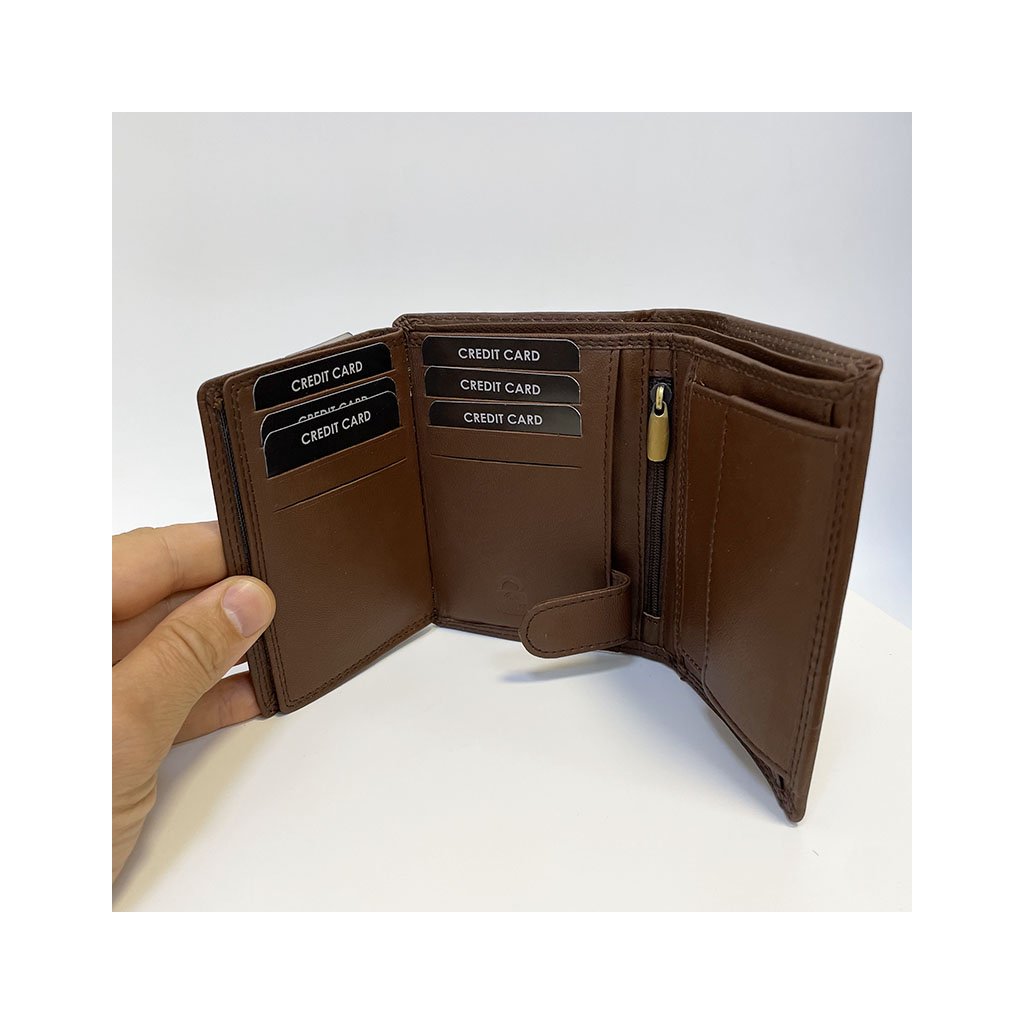 Tmavě hnědá kožená peněženka z měkké NAPPA kůže, na výšku, se zapínáním a RFID ochranou. Včetně ražby monogramu a možnosti laserového textu uvnitř.