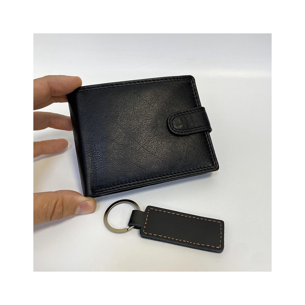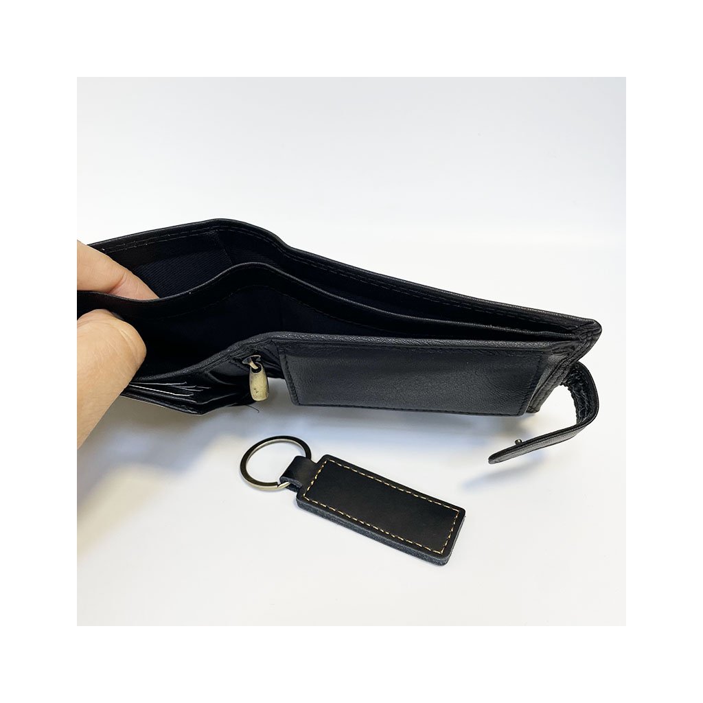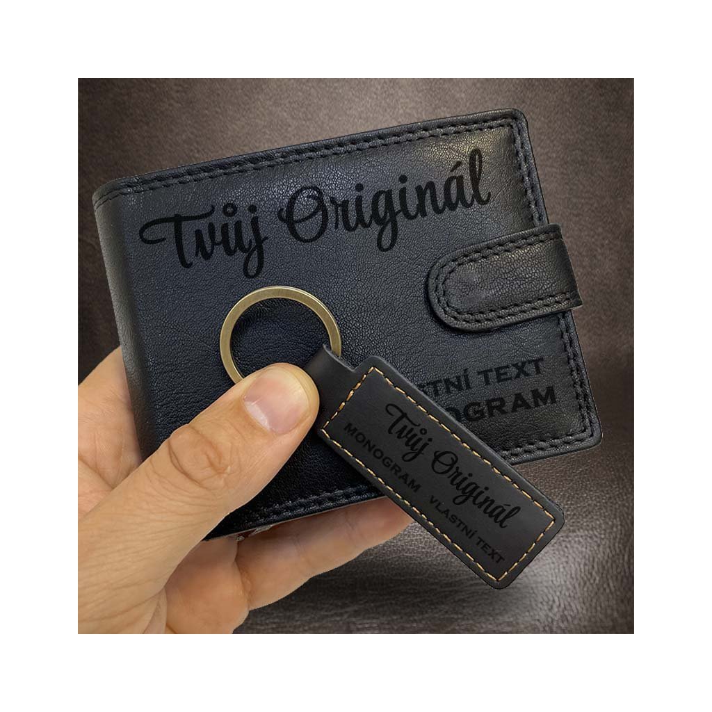 Černý kožený pánský set: peněženka se zapínáním a klíčenka. Ražba monogramu v ceně. Navíc možnost gravírování textu, věnování, loga i vlastní fotografie.