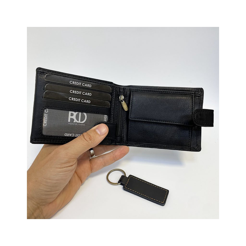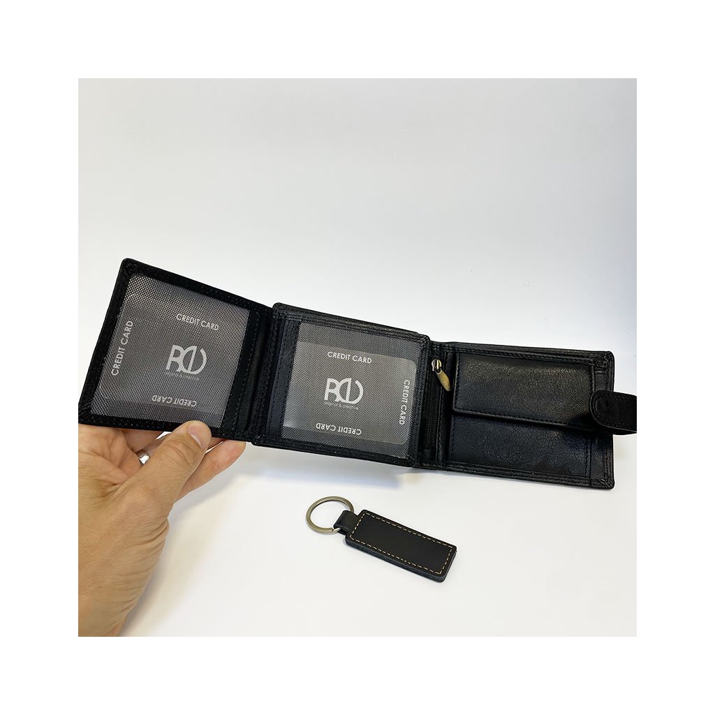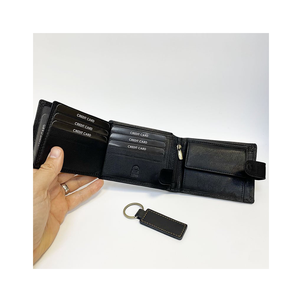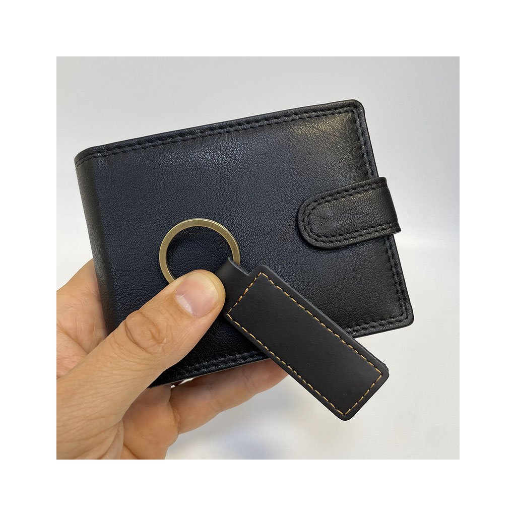 Černý kožený pánský set: peněženka se zapínáním a klíčenka. Ražba monogramu v ceně. Navíc možnost gravírování textu, věnování, loga i vlastní fotografie.