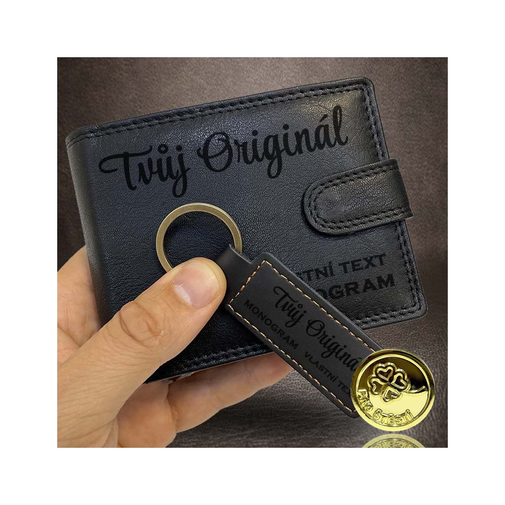 Pánský černý kožený set peněženky a klíčenky s vlastním monogramem, textem + Akce - zlatá mince Pro štěstí ZDARMA
