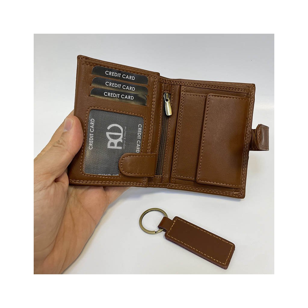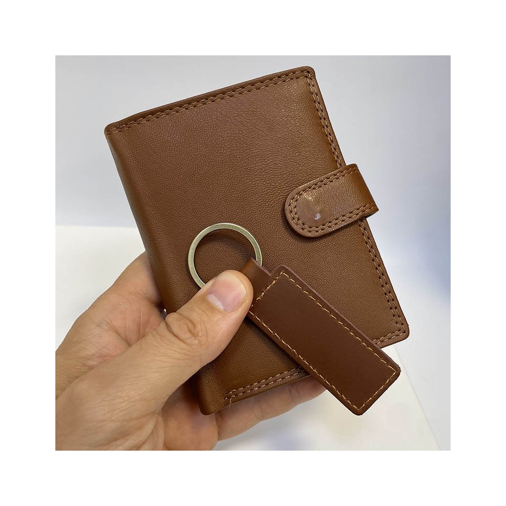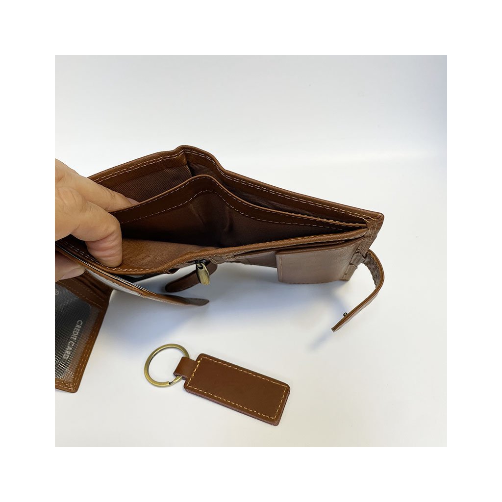 Elegantní kožený set ve světle hnědé barvě obsahuje peněženku na výšku se zapínáním a praktickou klíčenku ve stejném designu. Ideální jako originální dárek i osobní komplet pro muže, který ví, co je kvalita.