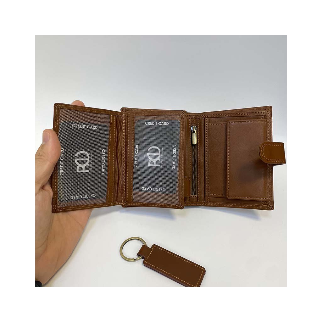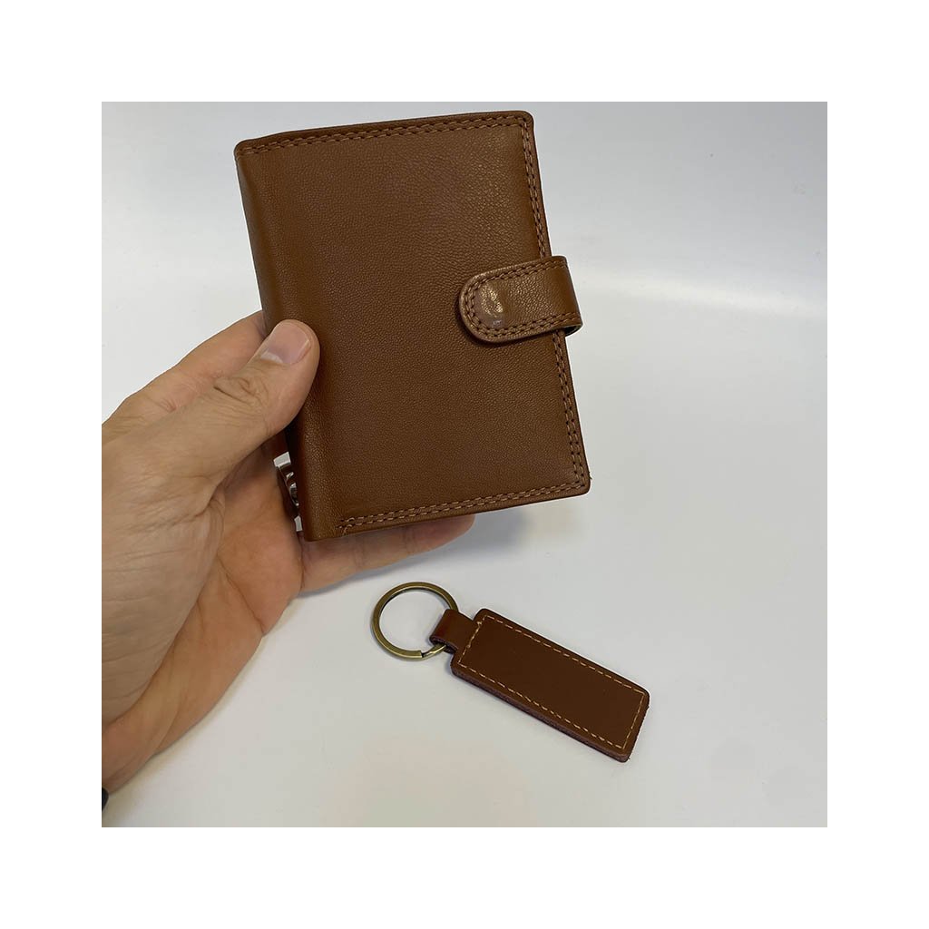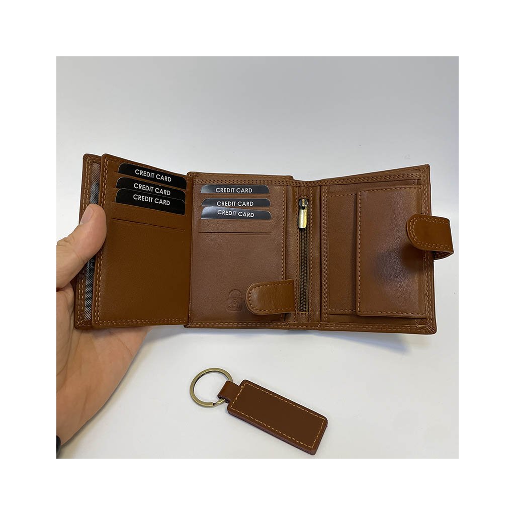 Elegantní kožený set ve světle hnědé barvě obsahuje peněženku na výšku se zapínáním a praktickou klíčenku ve stejném designu. Ideální jako originální dárek i osobní komplet pro muže, který ví, co je kvalita.