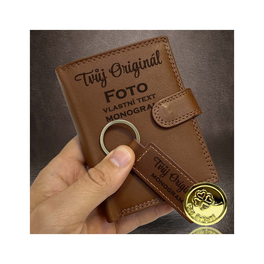 Pánský hnědý kožený set peněženky a klíčenky s vlastním monogramem, textem, fotkou + Akce - zlatá mince Pro štěstí ZDARMA