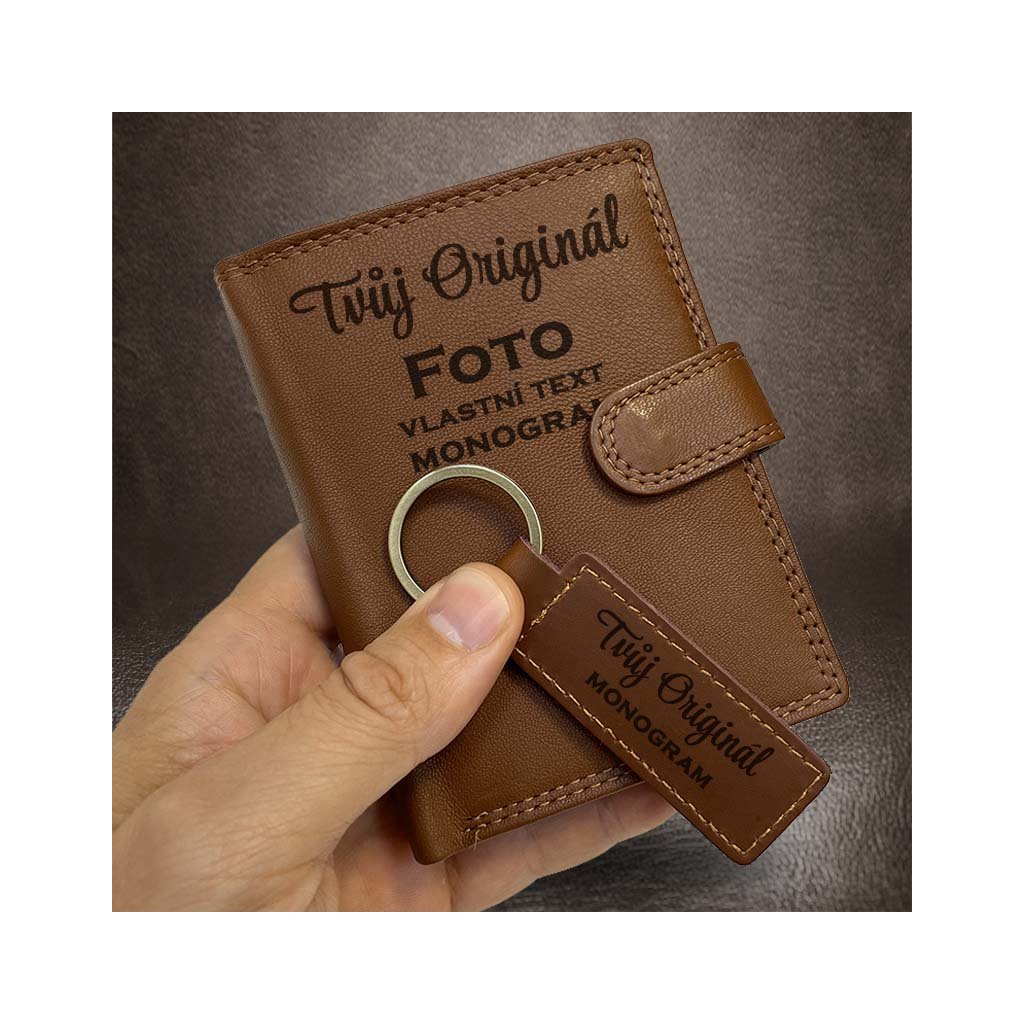 Tmavě hnědý kožený set: peněženka se zapínáním a klíčenka. Ražba monogramu v ceně. Gravírování textu, věnování, loga nebo fotky na přání.