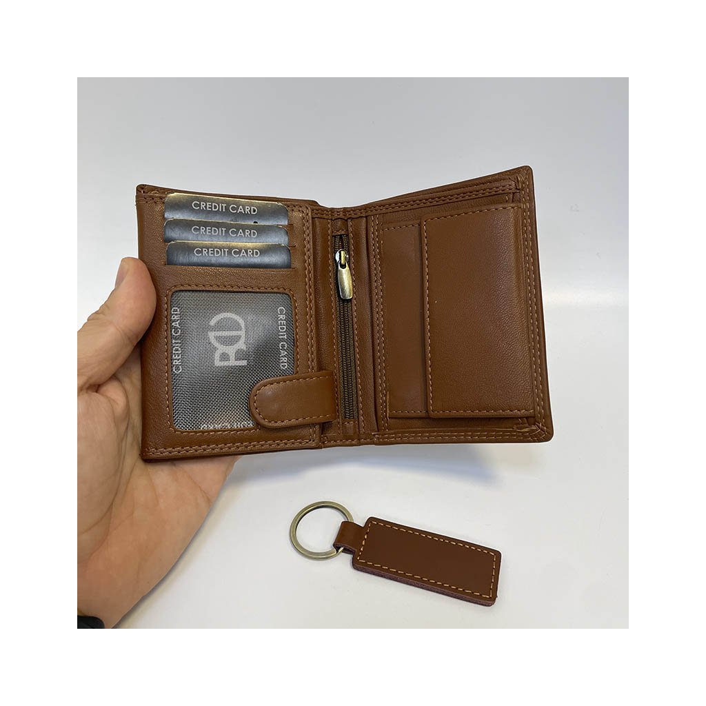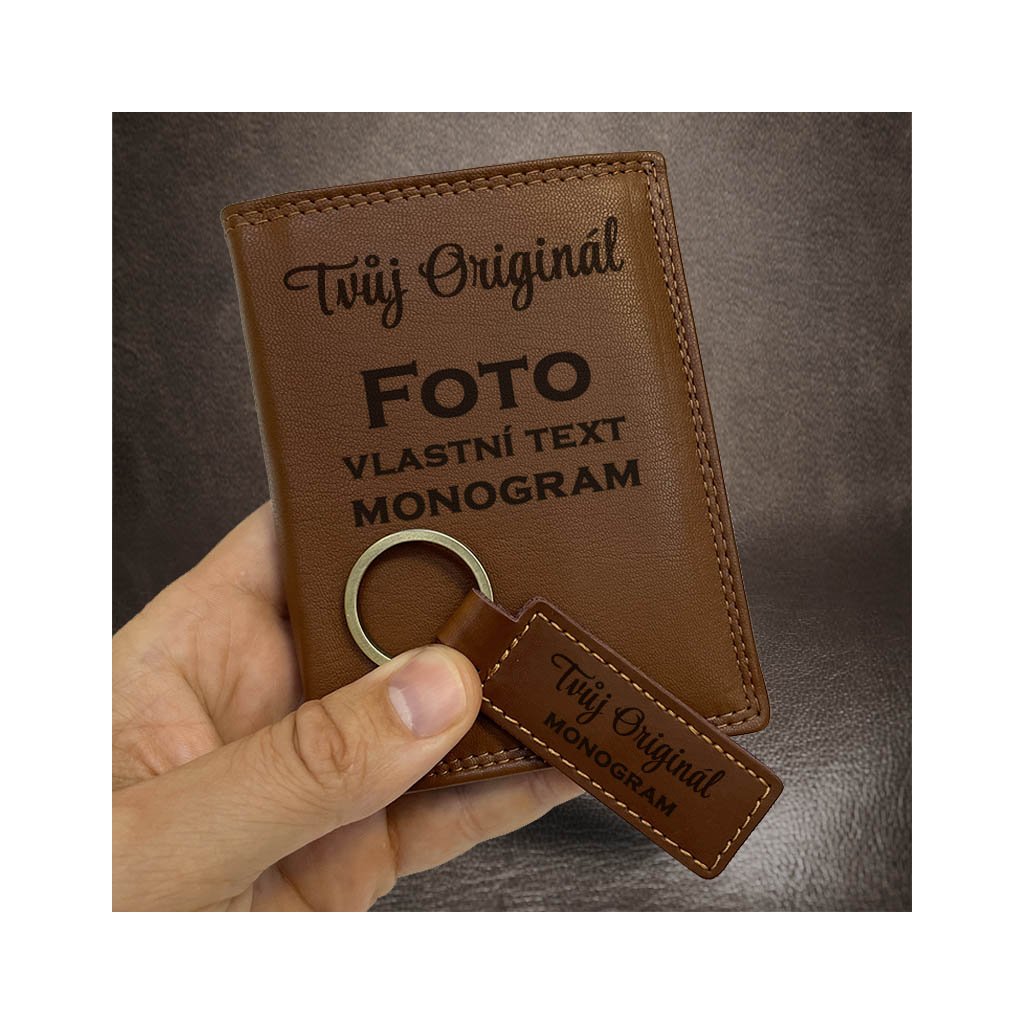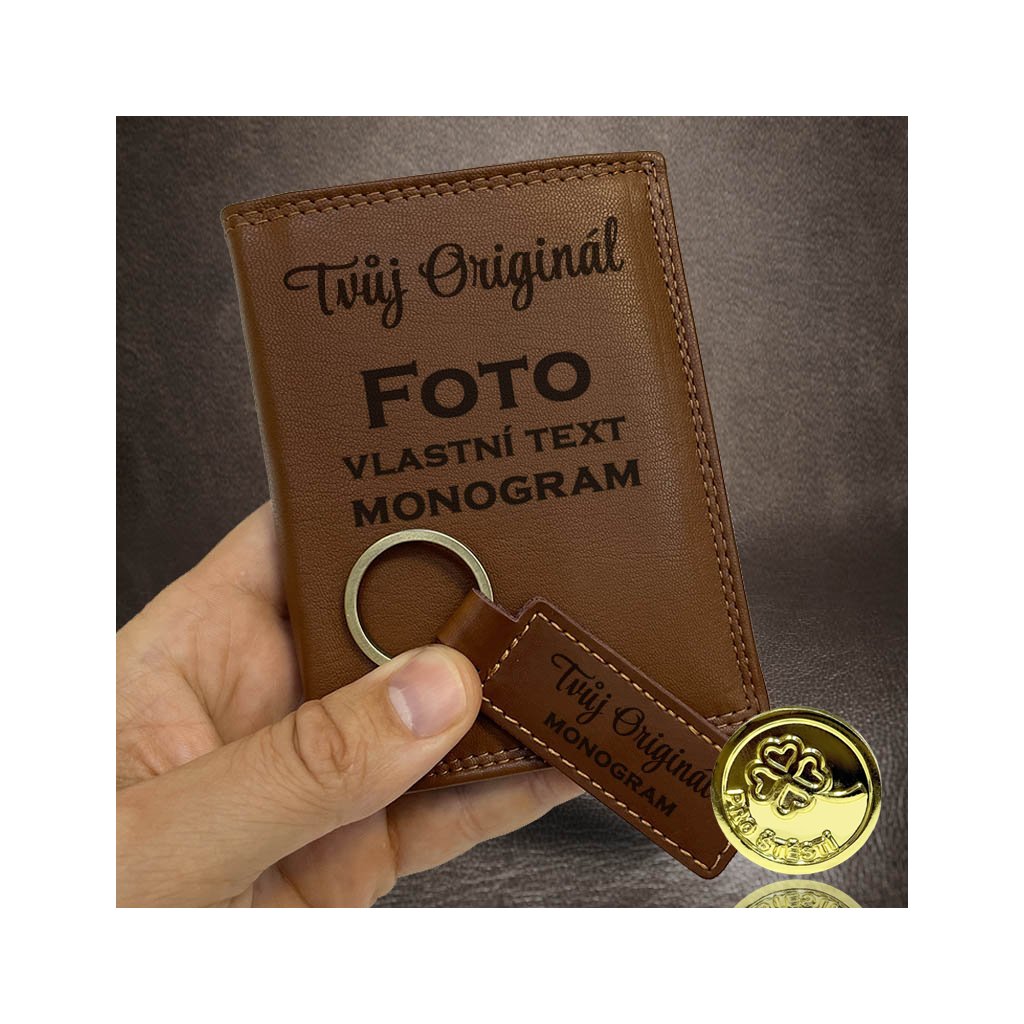 Pánský hnědý kožený set peněženky a klíčenky s vlastním monogramem, textem, fotkou + Akce - zlatá mince Pro štěstí ZDARMA
