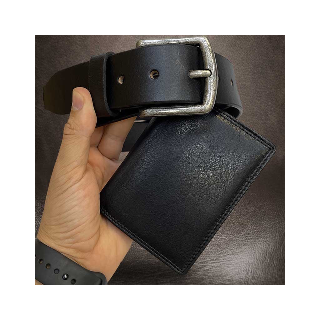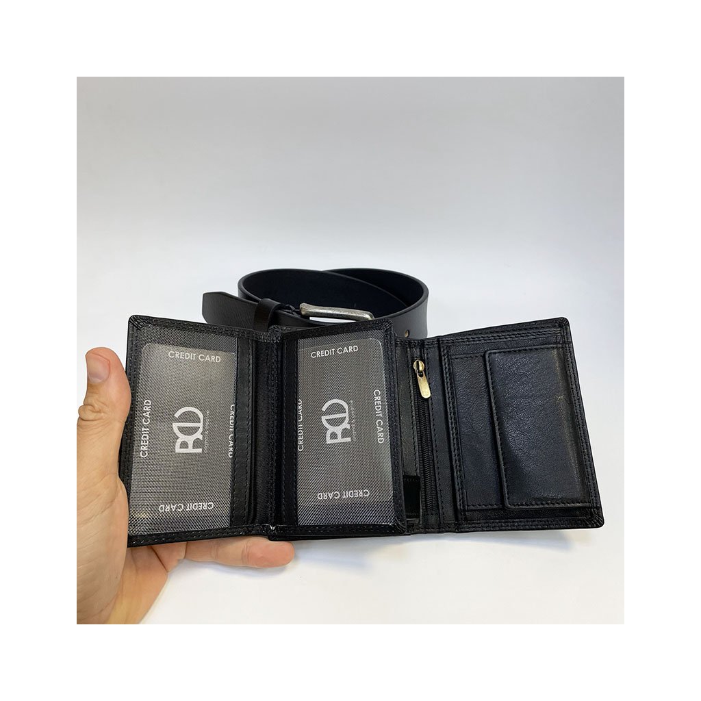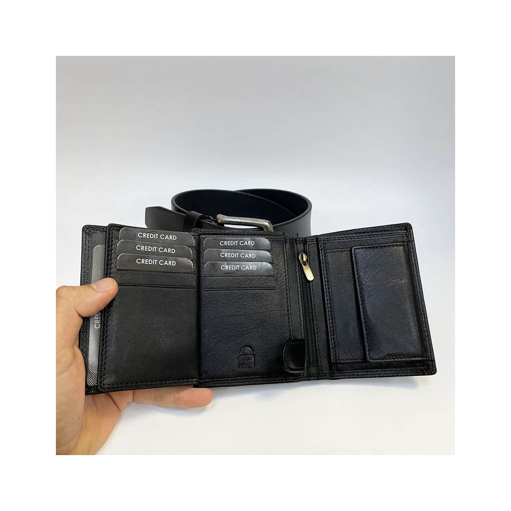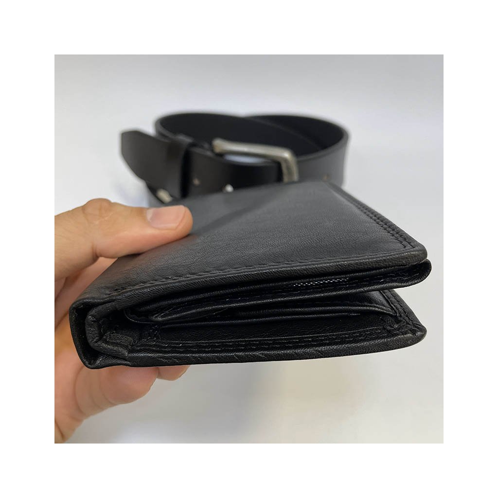 Elegantní černý set peněženky a pásku z pravé kůže s ražbou vlastního monogramu. Nadčasový design, RFID ochrana a dárkové balení. Styl, který mluví za vás.