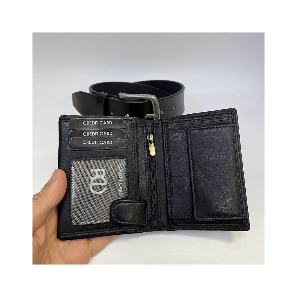 Stylový pánský kožený set v černém provedení: peněženka se zapínáním a pásek z pravé kůže s ražbou monogramu. Elegantní dárek v dárkovém balení.