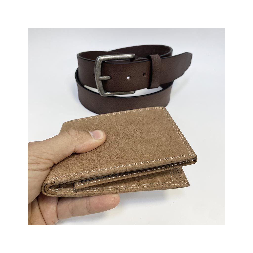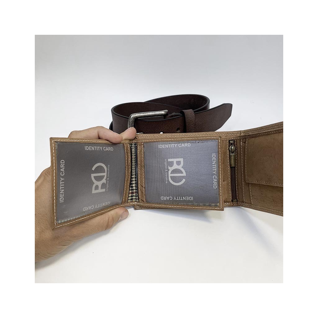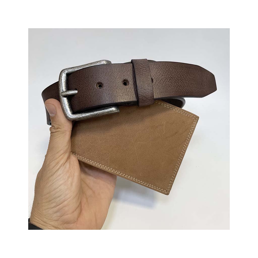 Součástí setu je klasická kožená peněženka a pásek z pravé hovězí kůže, které spolu barevně ladí a vytvářejí harmonický celek. Monogram dodává osobitost a jedinečnost – decentně a profesionálně vyražený přímo do kůže.