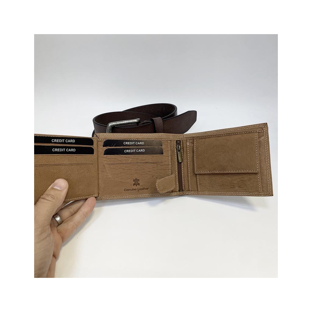 Elegantní hnědý kožený set z jemné kůže NAPPA. Obsahuje peněženku bez zapínání a pásek s možností ražby monogramu. Luxusní komplet v dárkovém balení.