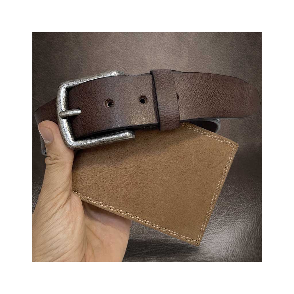 Prémiový pánský set z pravé kůže v tmavě hnědém odstínu. Obsahuje elegantní koženou peněženku a kvalitní kožený pásek s možností ražby vlastního monogramu. Včetně dárkového balení.