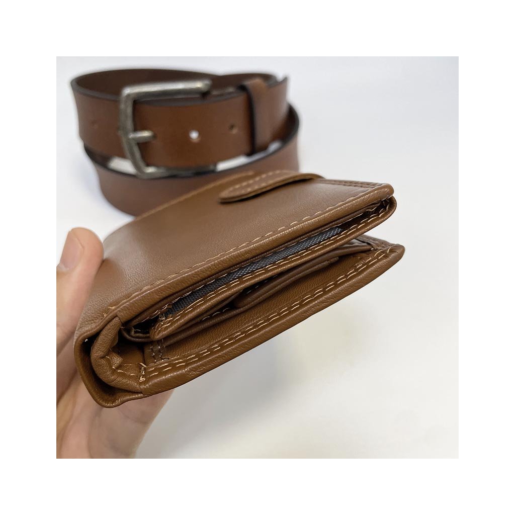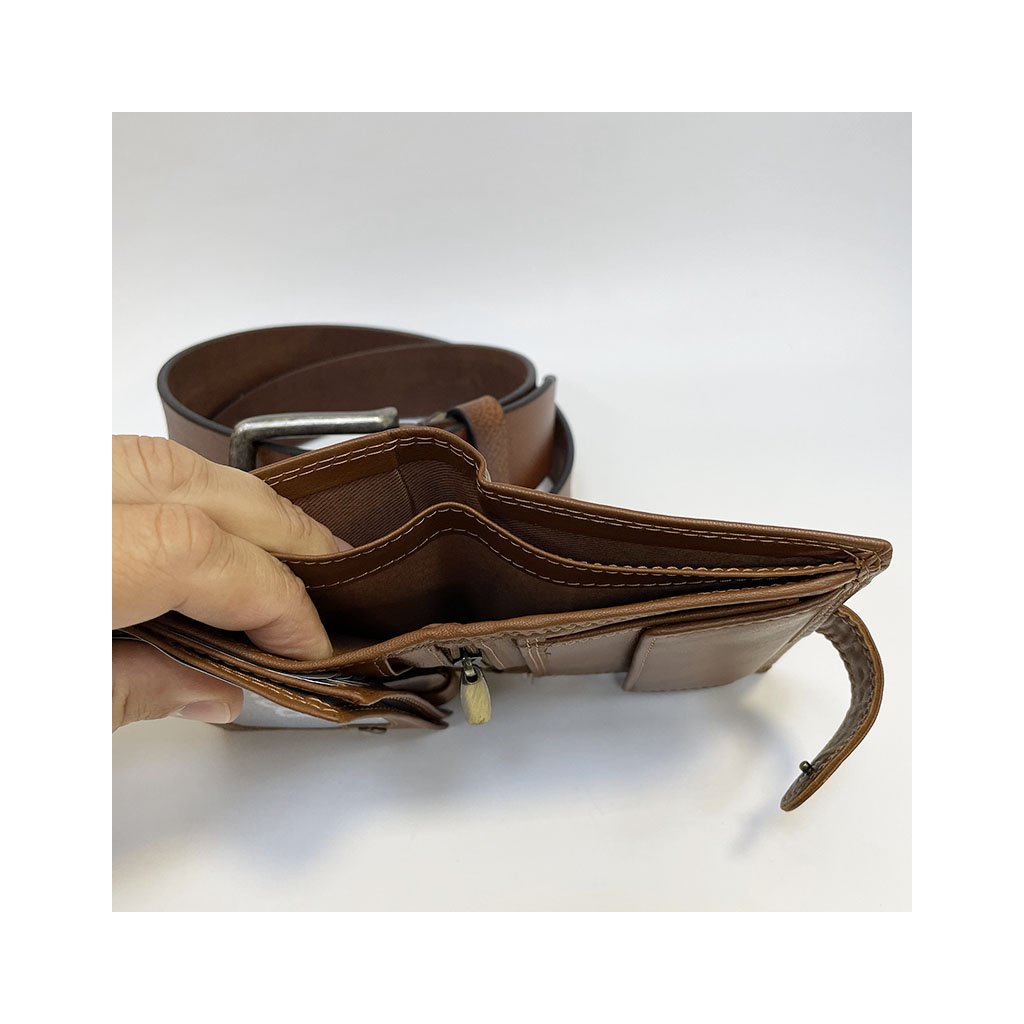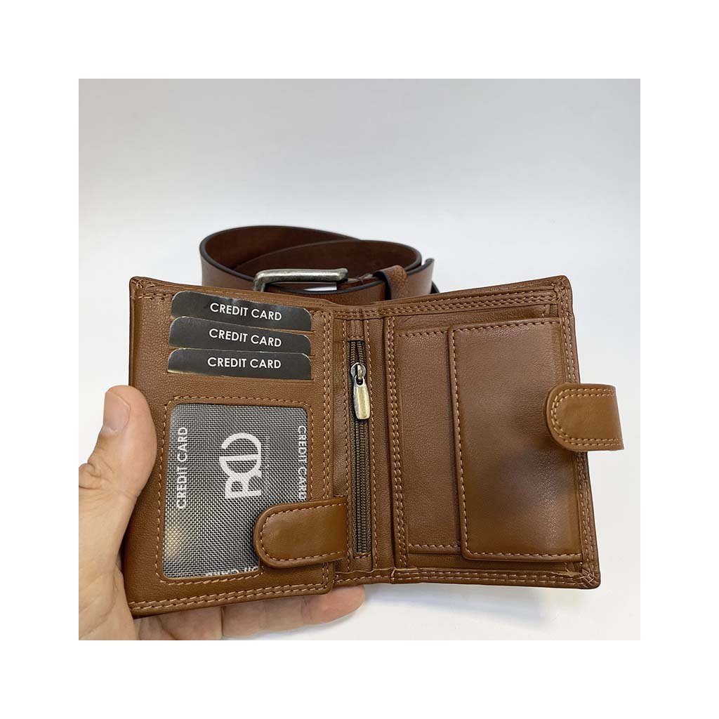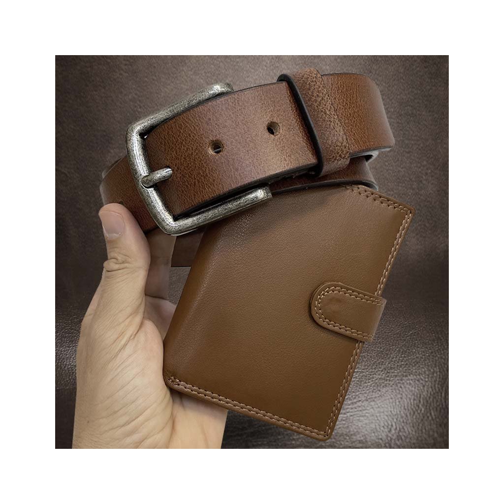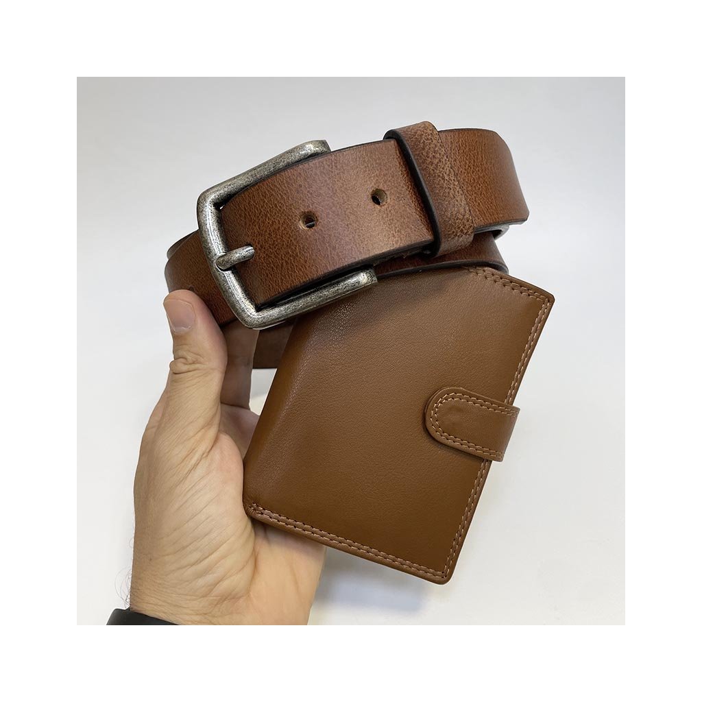 Elegantní hnědý kožený set z jemné kůže NAPPA. Obsahuje peněženku bez zapínání a pásek s možností ražby monogramu. Luxusní komplet v dárkovém balení.