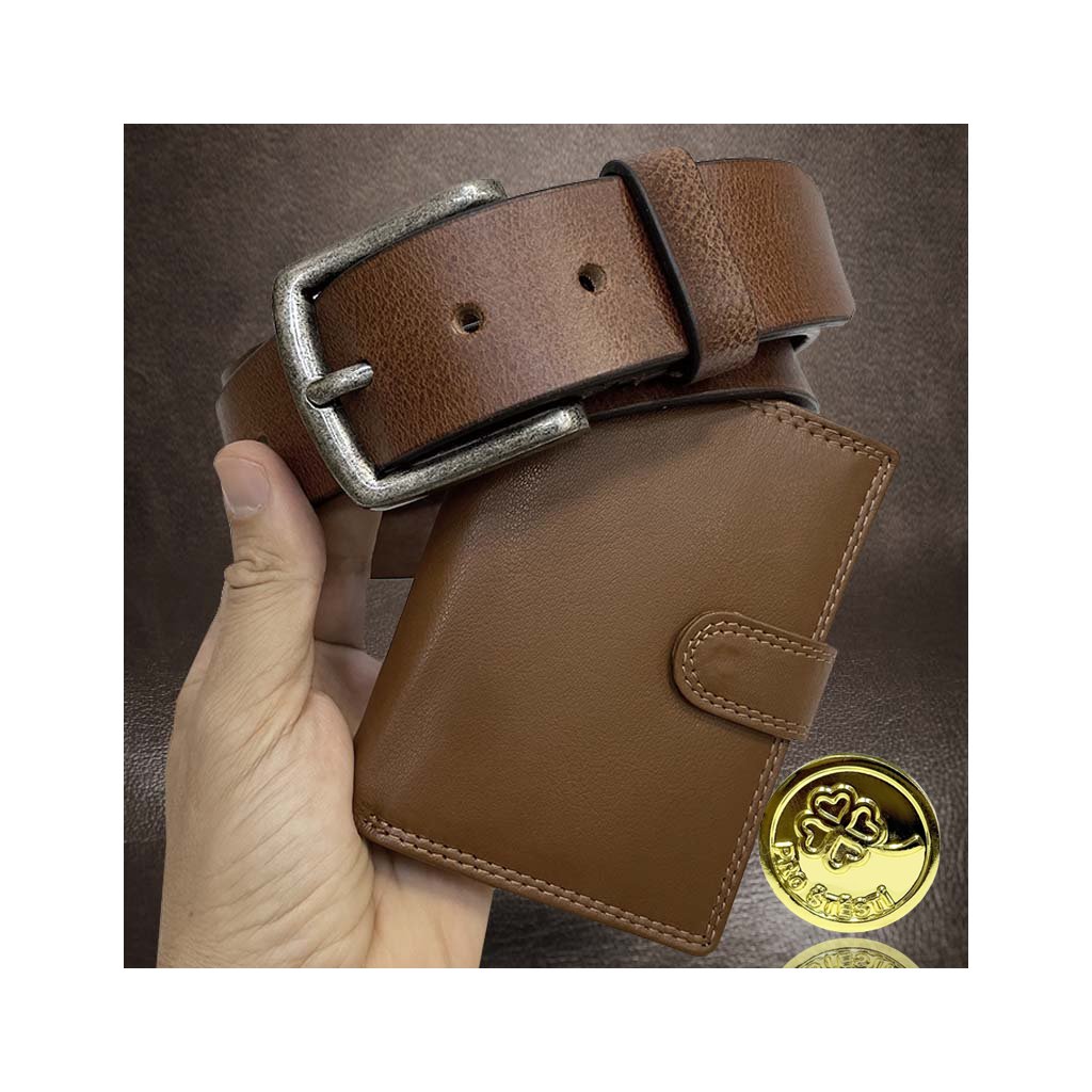 Pánský kožený hnědý set NAPPA BEORIGINAL Leather kožená peněženka a kožený pásek s monogramem (ražba) + Akce - zlatá mince Pro štěstí ZDARMA