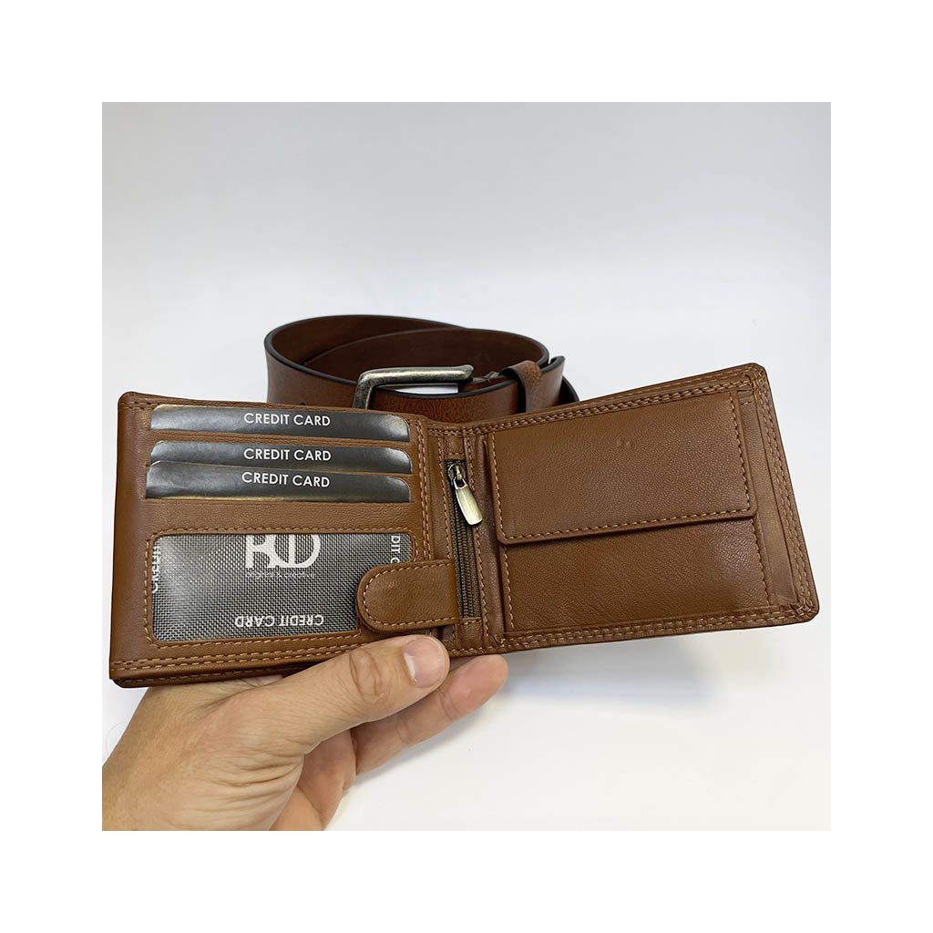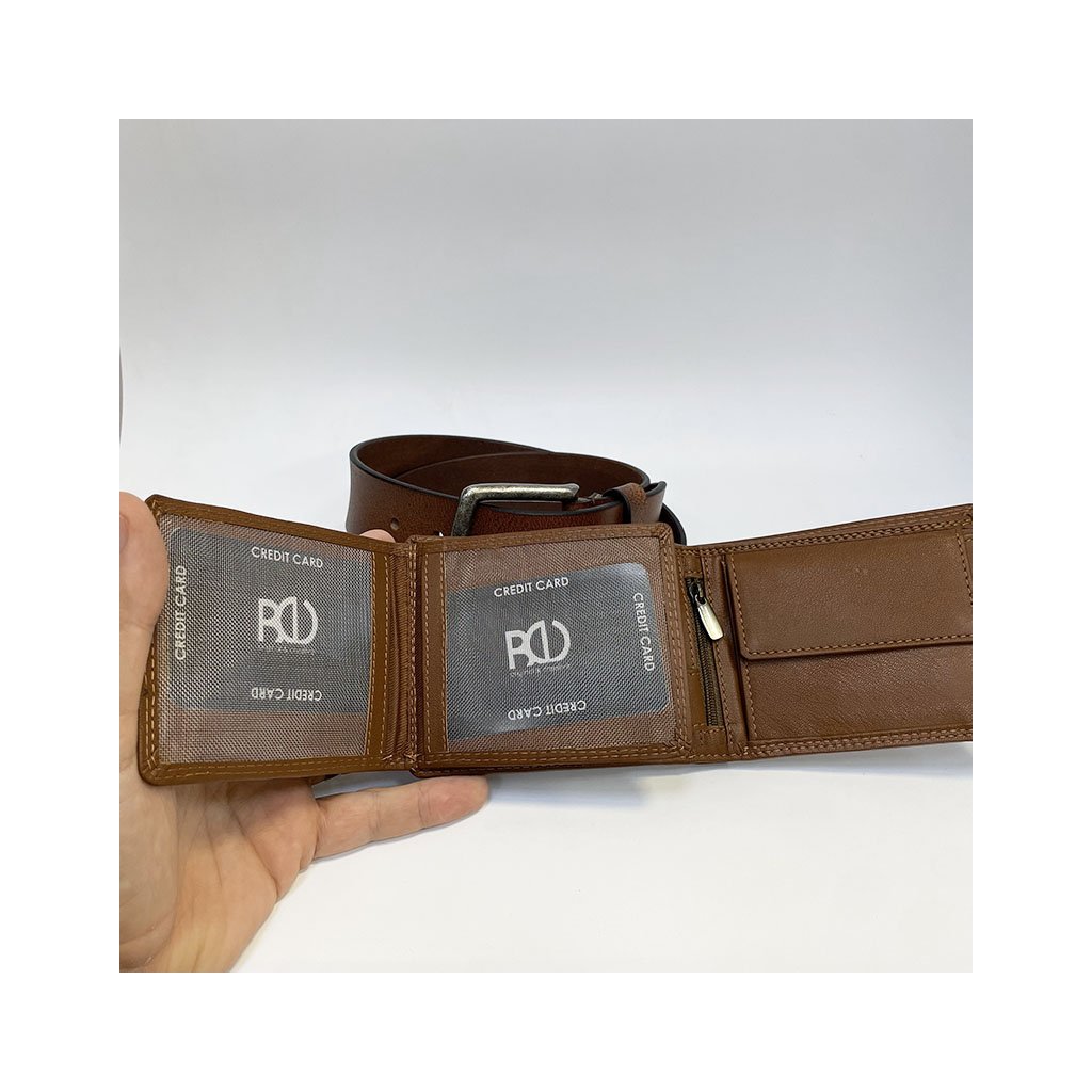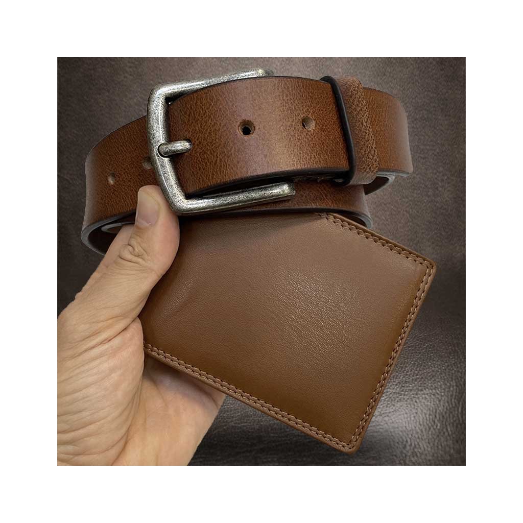 Elegantní hnědý kožený set z jemné kůže NAPPA. Obsahuje peněženku bez zapínání a pásek s možností ražby monogramu. Luxusní komplet v dárkovém balení.