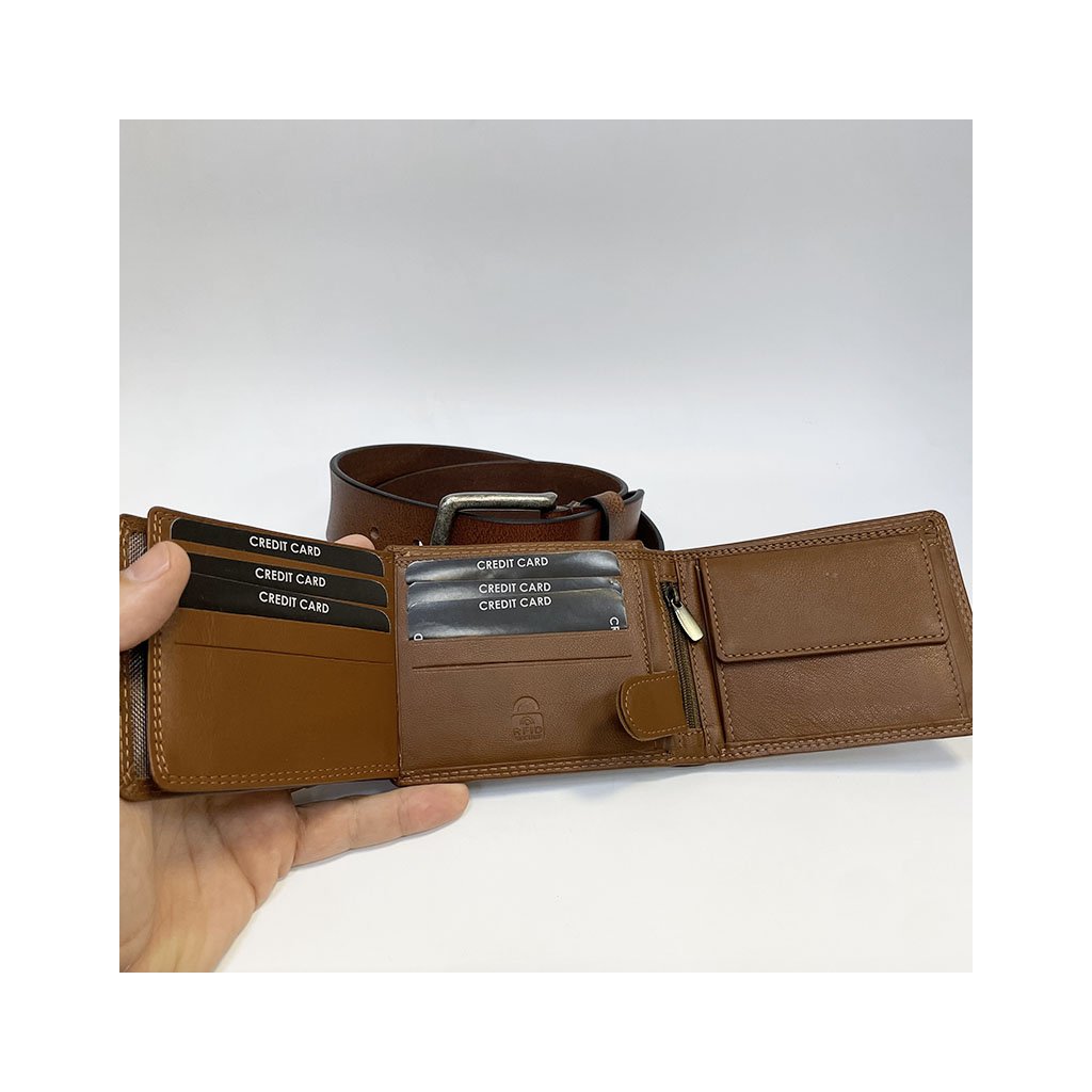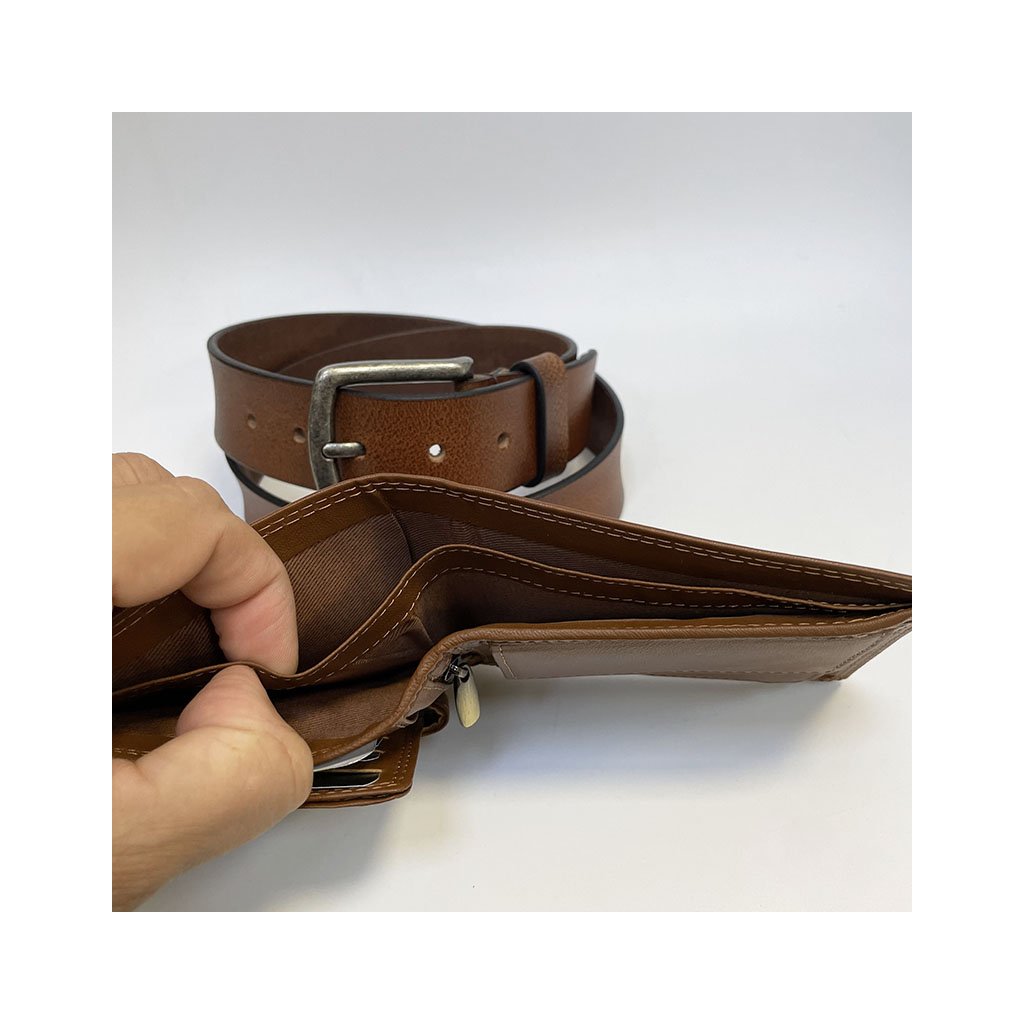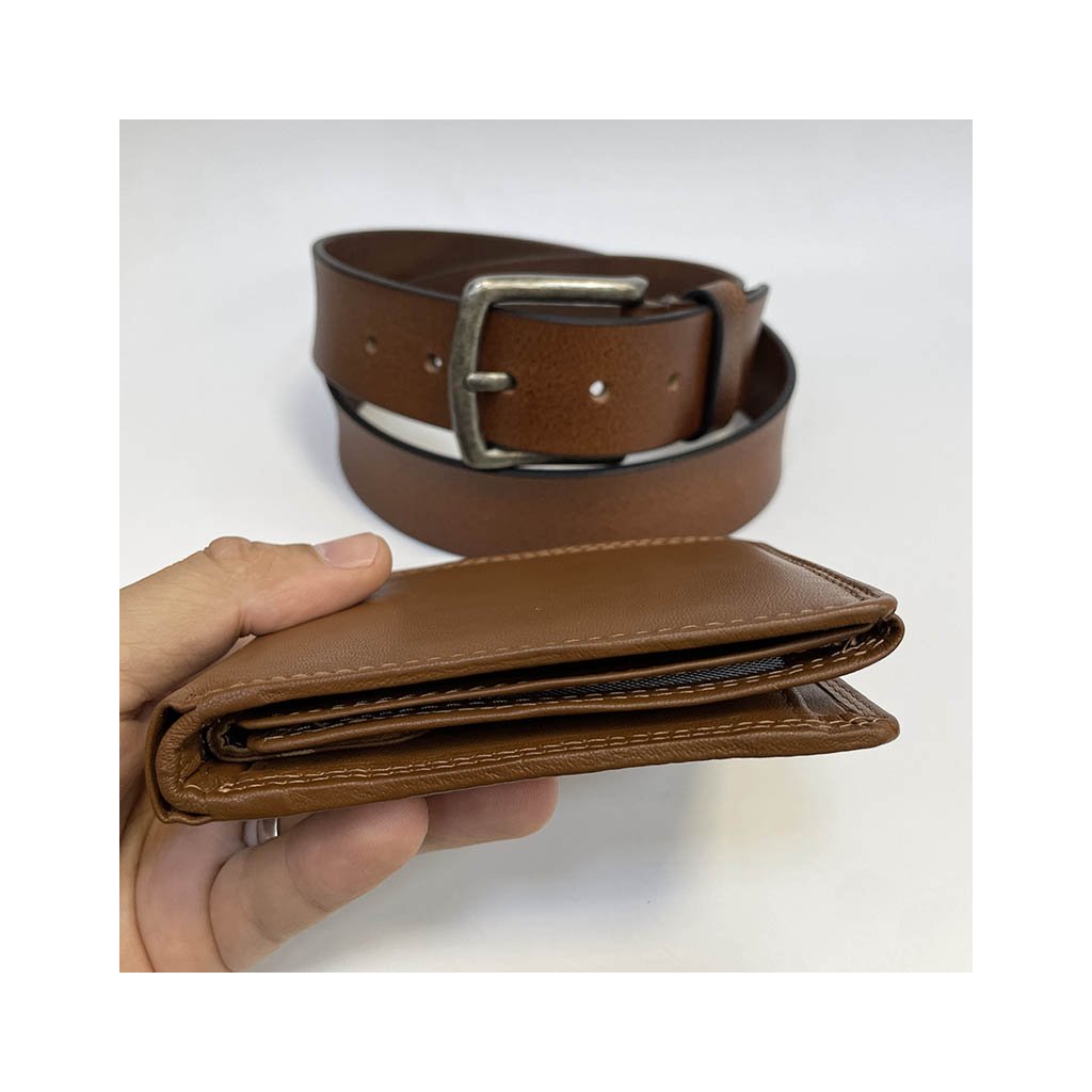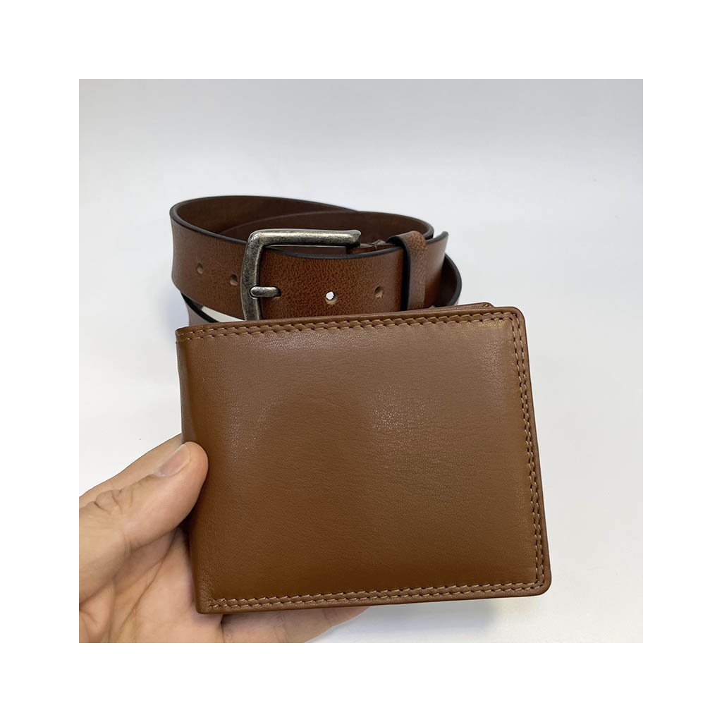 Elegantní hnědý kožený set z jemné kůže NAPPA. Obsahuje peněženku bez zapínání a pásek s možností ražby monogramu. Luxusní komplet v dárkovém balení.