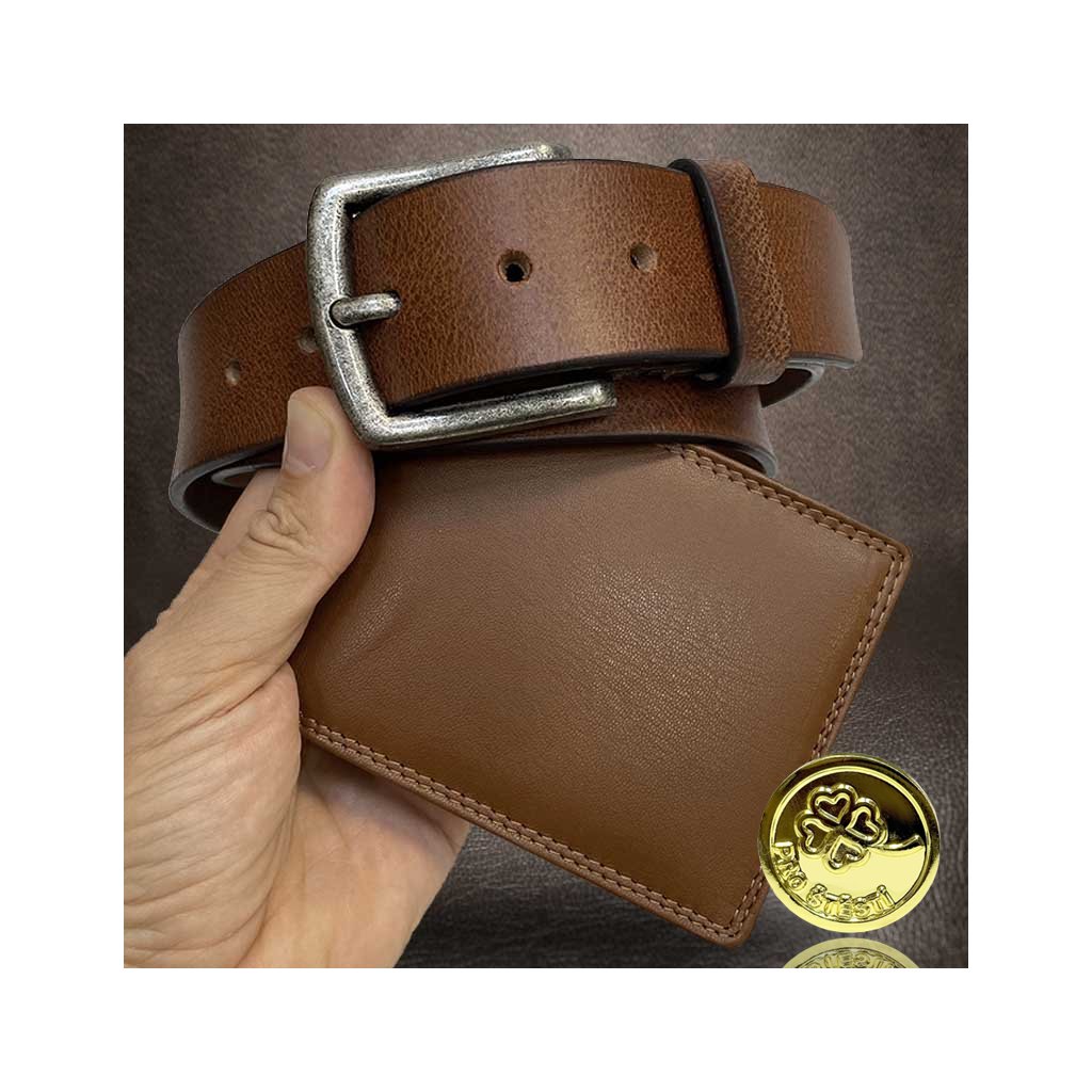 Pánský kožený hnědý set NAPPA BEORIGINAL Leather kožená peněženka a kožený pásek s monogramem (ražba) + Akce - zlatá mince Pro štěstí ZDARMA