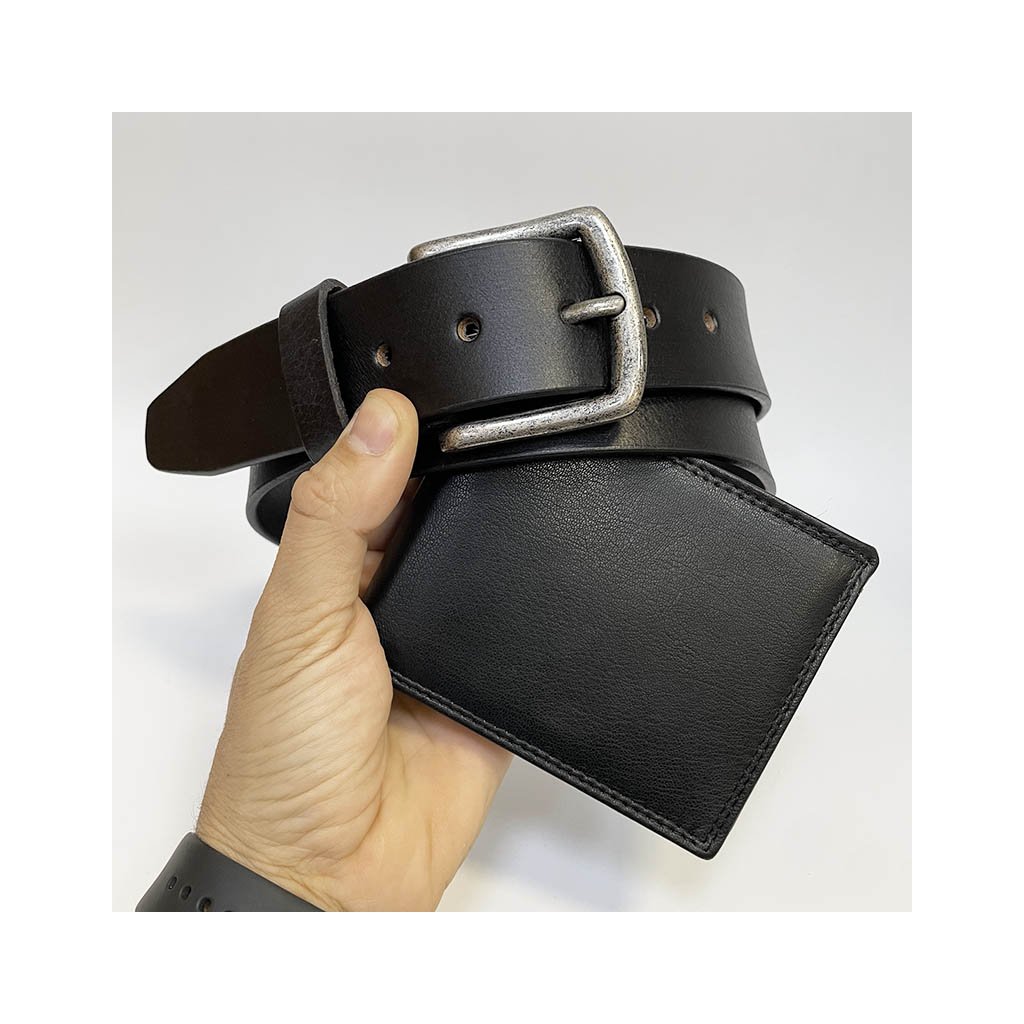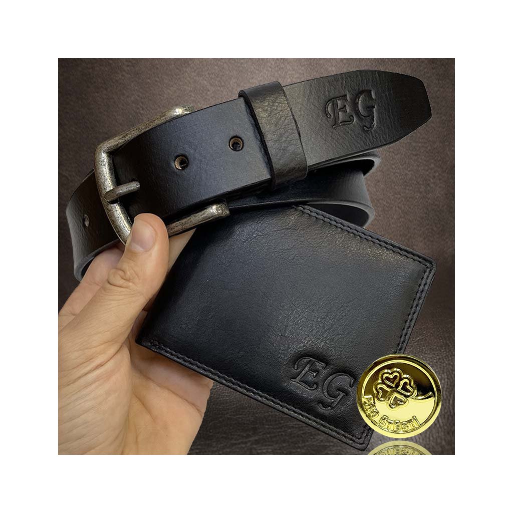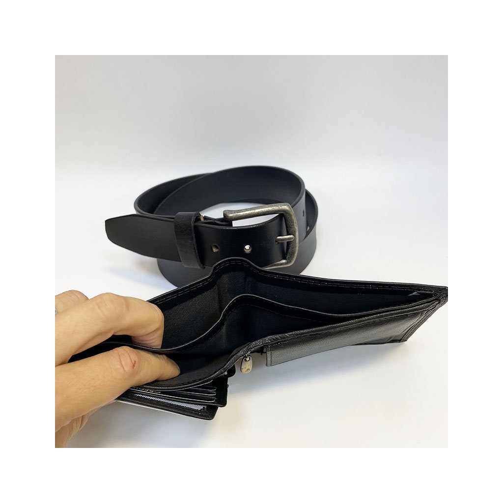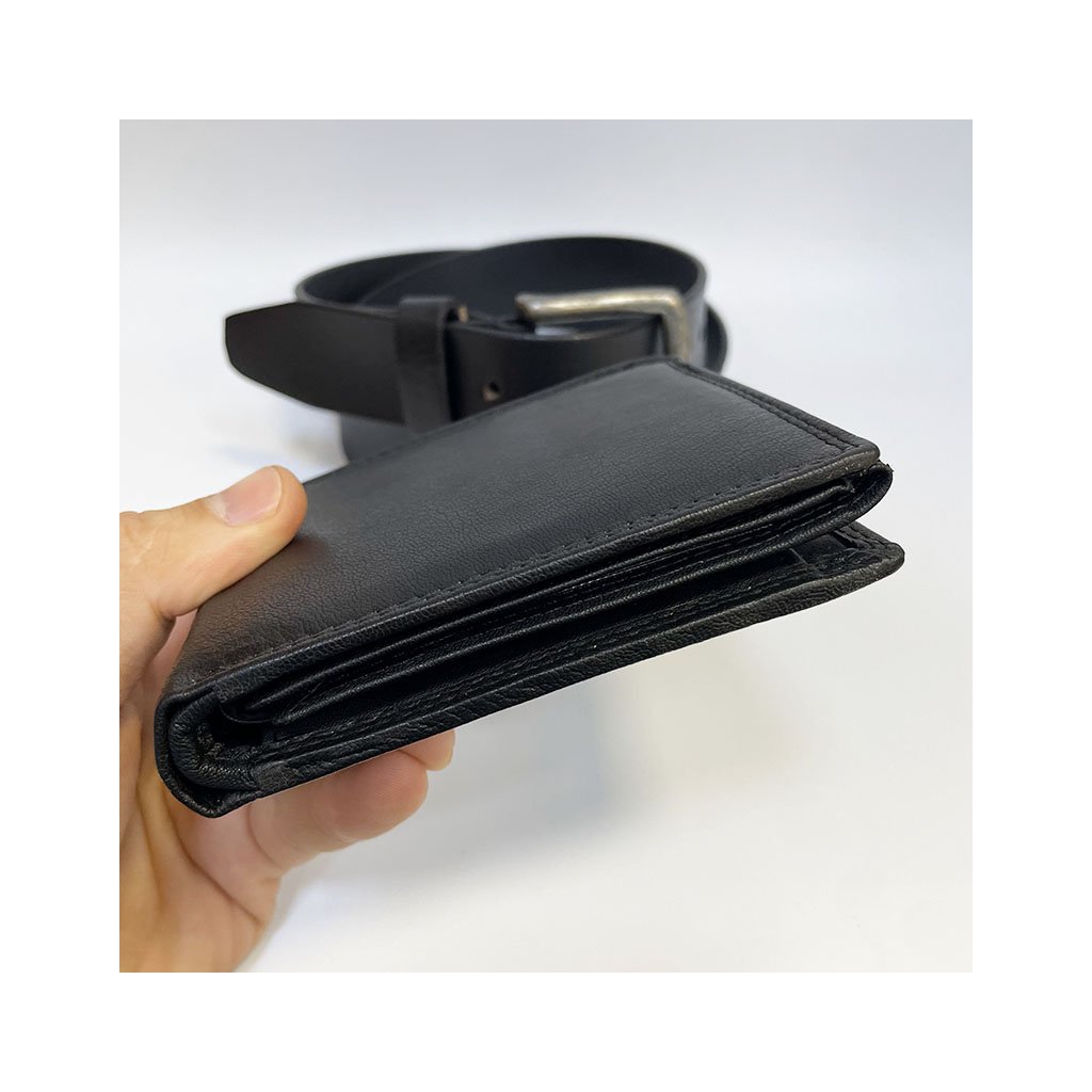 Pánský kožený set BEORIGINAL Leather černá kožená peněženka a kožený pásek s monogramem (ražba) + Akce - zlatá mince Pro štěstí ZDARMA